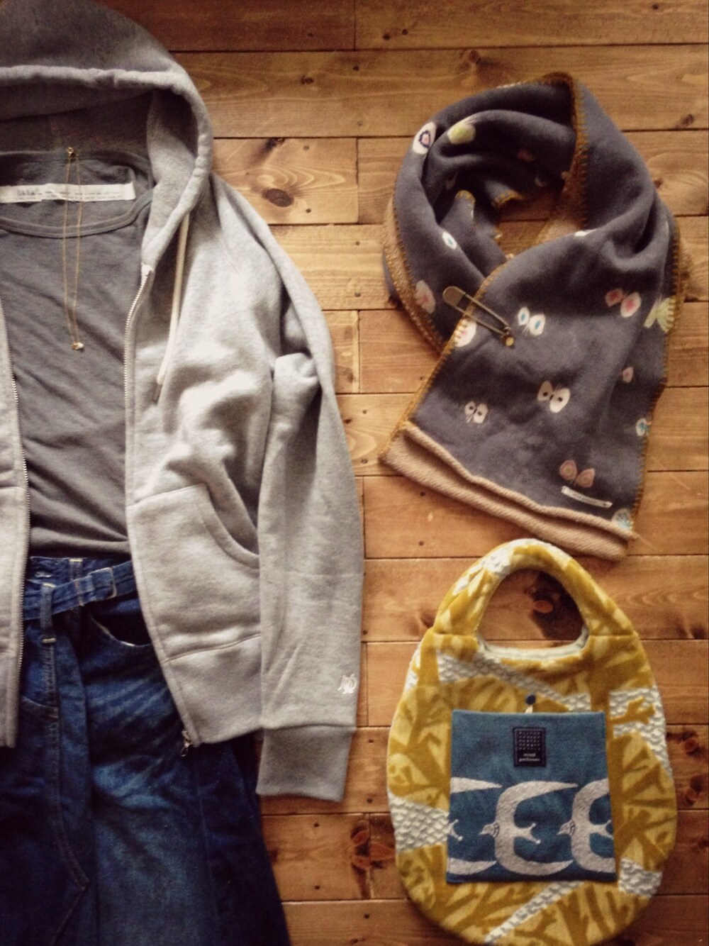 カットソー/GASA リメイクデニムキュロット/JOURNAL STANDARD バッグ、マフラー/mina perhonen アクセサリー/atelier bloom ちょうちょ×ちょうちょ∞