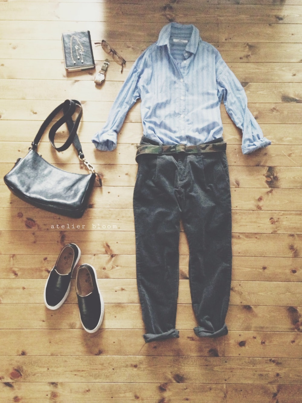アクセサリー/atelier bloom 淡水パールちょうちょネックレス 淡水パールちょうちょピアス tops/journal standard pants/無印良品 shoes/nano・universe bag/IL BISONTE ストライプシャツに コーデュロイのタックパンツ。 迷彩ベルトと、斜めがけの革かばん。 男前服に、華奢なパールのアクセサリー。
