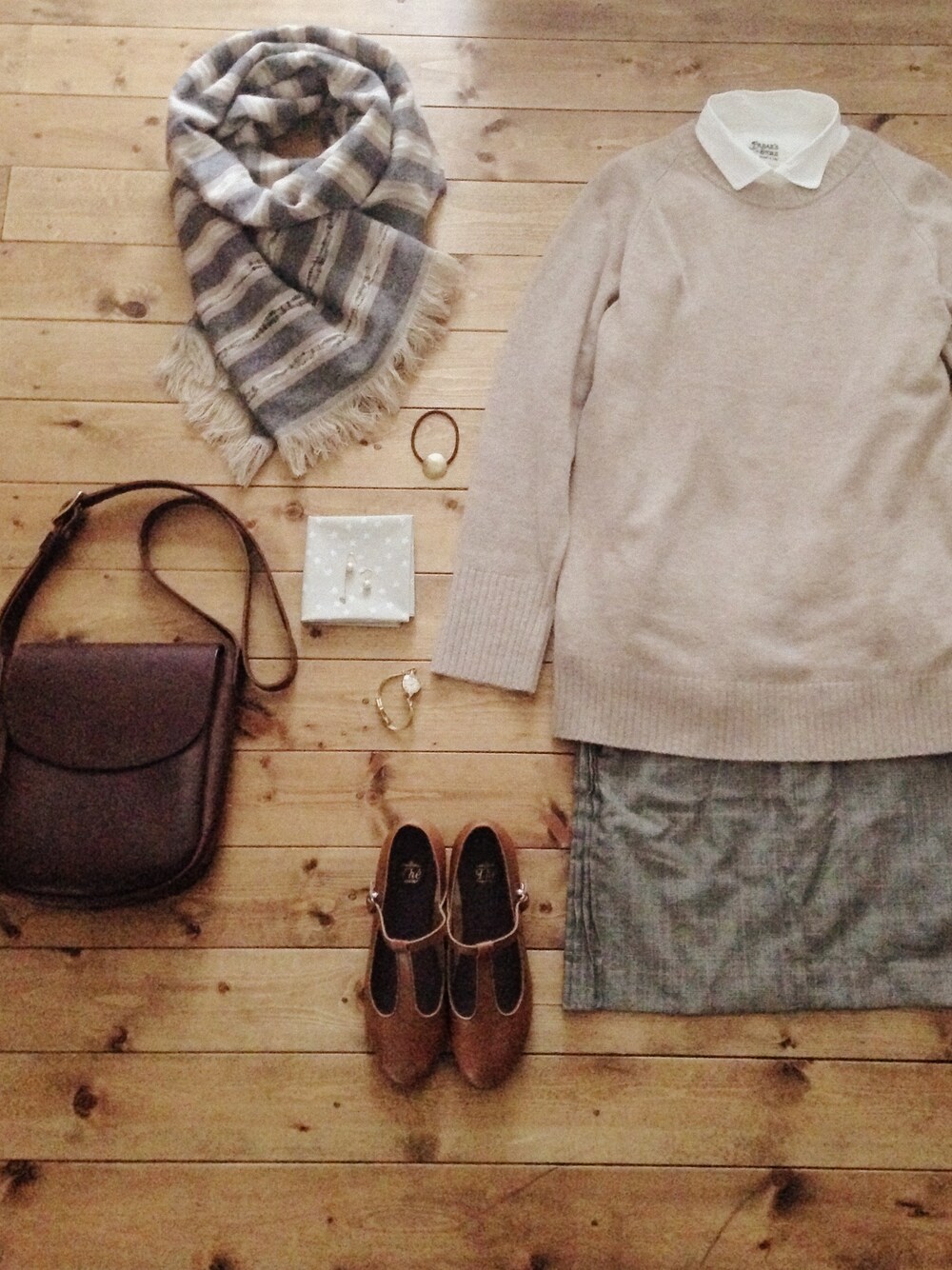 ウールストール/nano universe スカート/used コットンパールピアス/atelier bloom shoes/The bag/affordance watch/OMEGA(アンティーク) ストラップシューズと白シャツ。 グレイ、ピンク、ベージュ 3色入ったストール。 春先まで使いまわせてお気に入り。