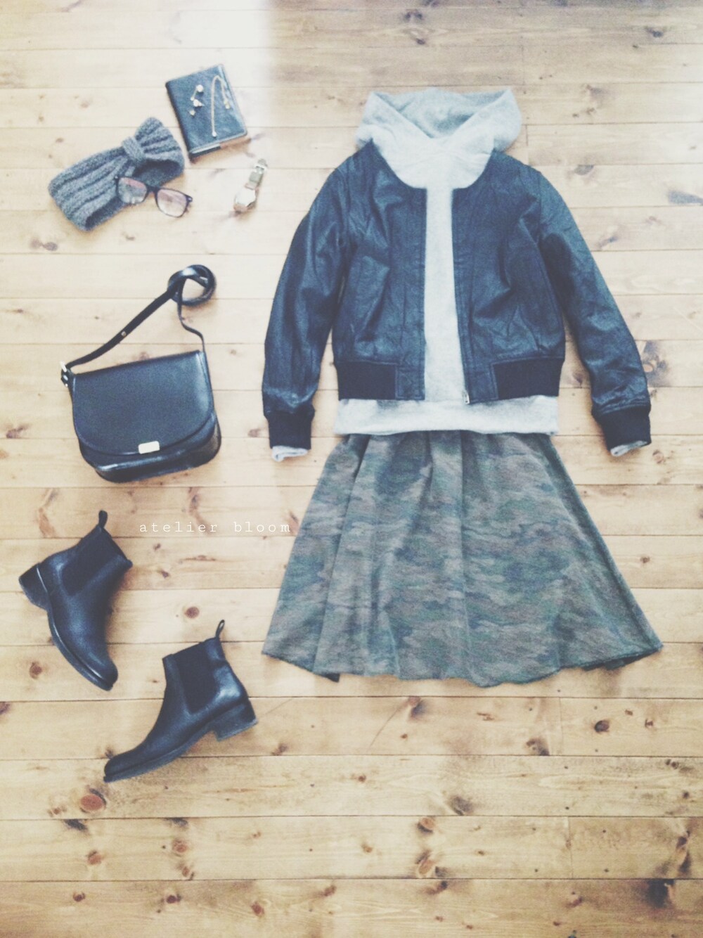 アクセサリー/atelier bloom コットンパールちょうちょ2wayピアス 淡水パールちょうちょネックレス。 used迷彩スウェットスカート×レザーブルゾンの 古着mixコーデ。
