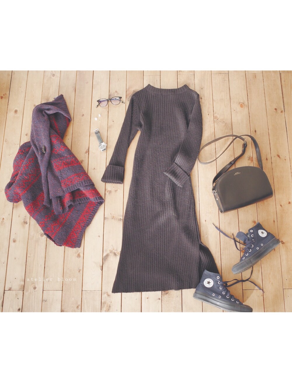 陶の宝石ピアス白/atelier bloom リブニットワンピース、 ノルディックストール。 instagram @atelierbloom
