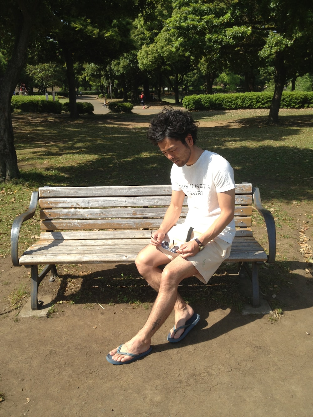 atelier comoptiプリントTシャツ[this is] ショーツはグラミチ サンダルはマークジェイコブス サングラスはA.P.C 公園が気持ち良い季節ですね〜