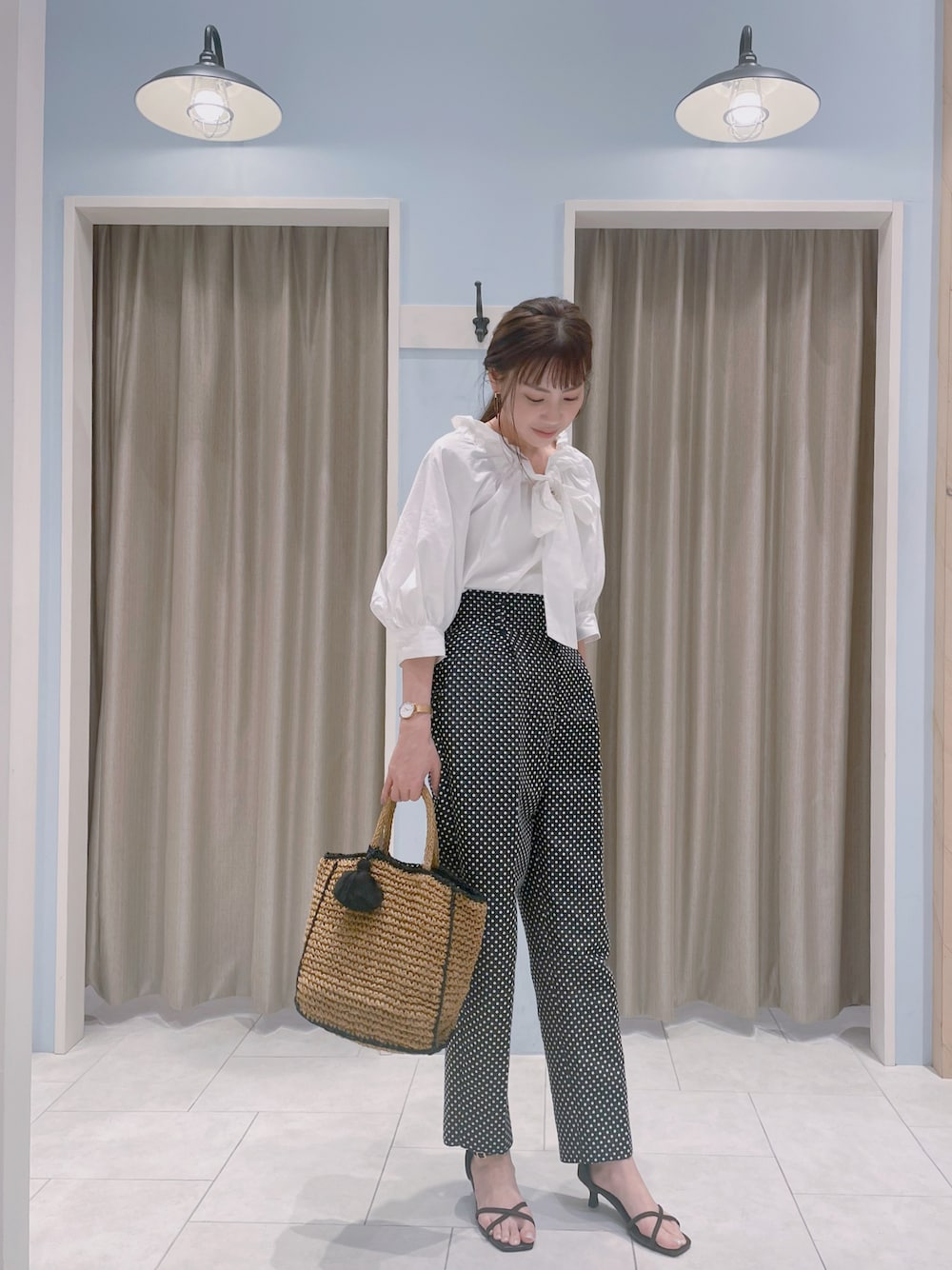 夏にぴったりのキレイめコーディネートです♪ 襟元が華やかなボウタイブラウスは、かっこよくもフェミニンにも合いますꕤ୭* パンツは張り感もあり、センタープレスのシルエットでスタイルup効果◎