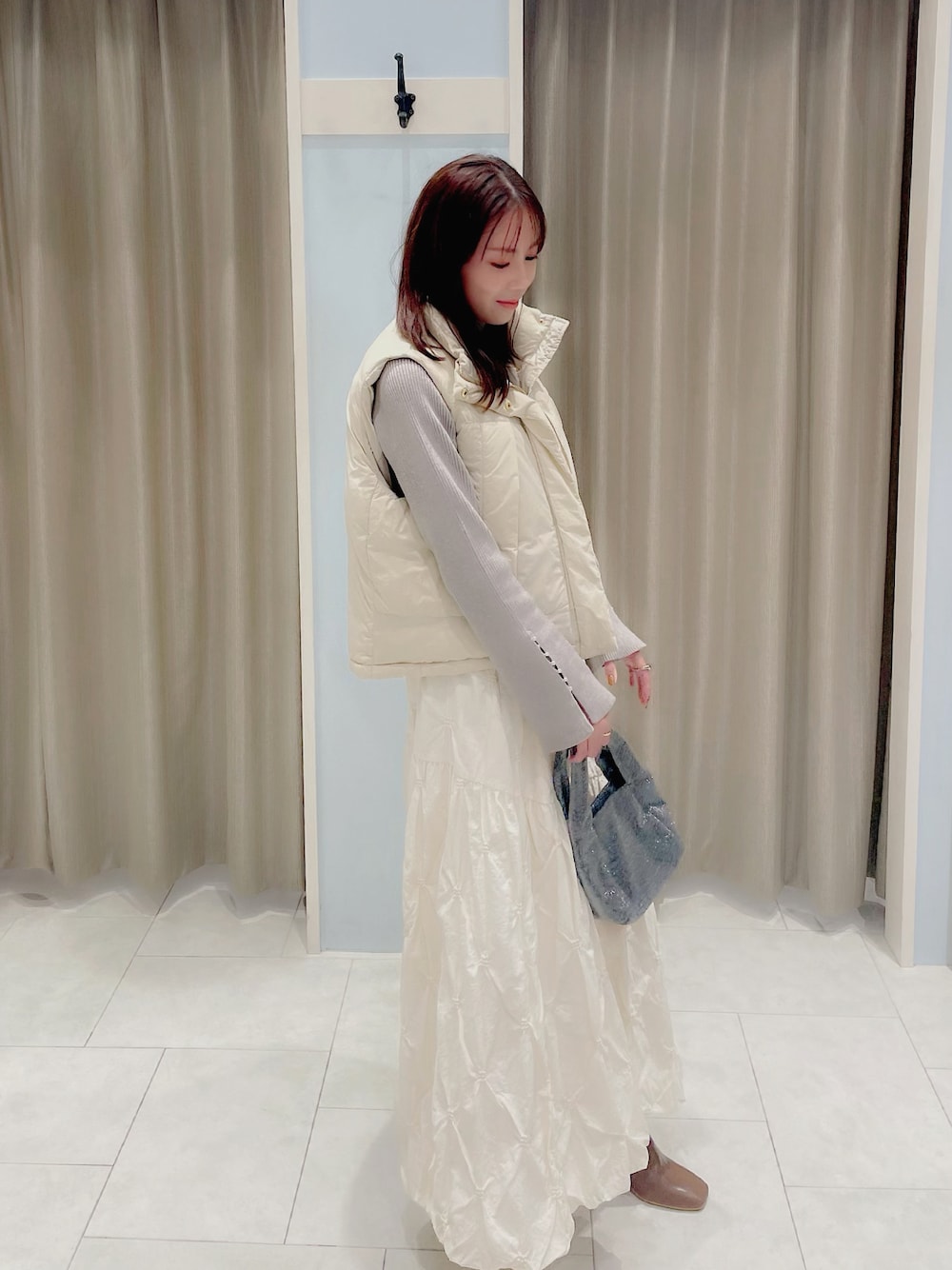 スカートデザインのキルト刺繍がインパクトありながらも、合わせやすいバルーンシルエットになっています☺️ キレイめニットから、カジュアルスウェットまで幅広いコーディネートが楽しめます♫ ベストはショート丈なので、 小柄さんにもピッタリです🤍