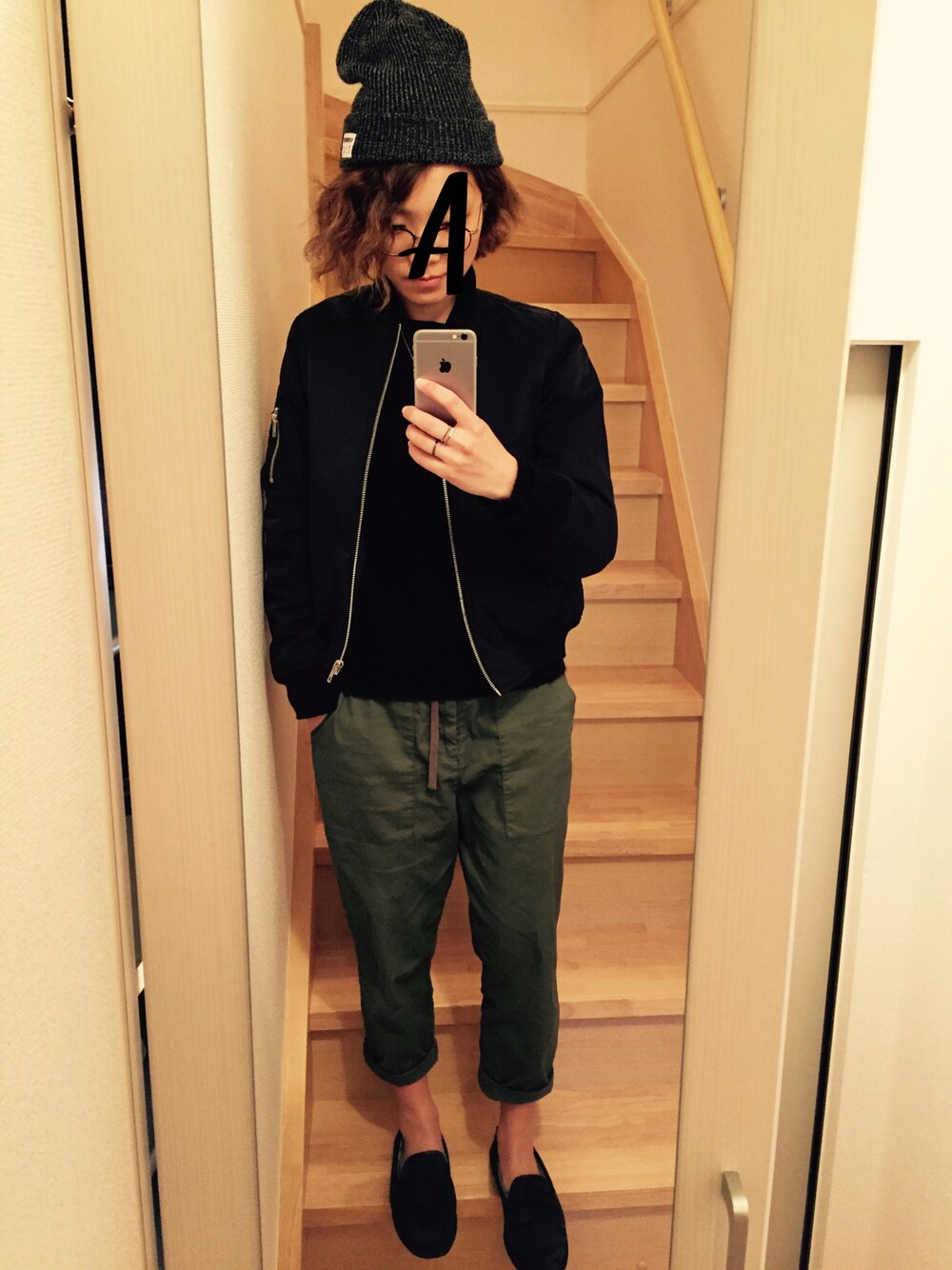 やっと休みです。 らくちんコーデ。 カーキとブラックの組み合わせ好きです。