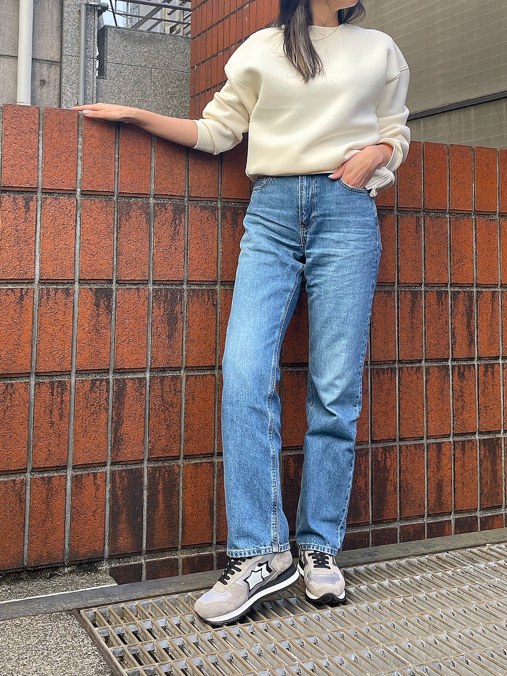 スウェット× デニムの楽チンコーデも、合わせるスニーカーに拘ればおしゃれ見え!