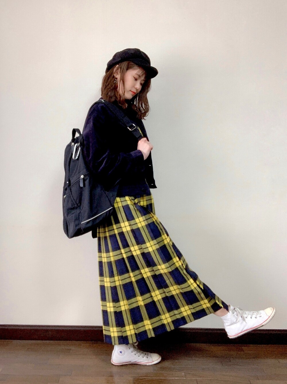 おはようございます! コーデュロイジャケット×リュック×スニーカーで キルトスカートをカジュアルダウン スニーカーは写真だと見えづらいけど、白の革なのでカジュアルになりすぎなくてお気に入りです◎ Instagram▶︎mooon_618