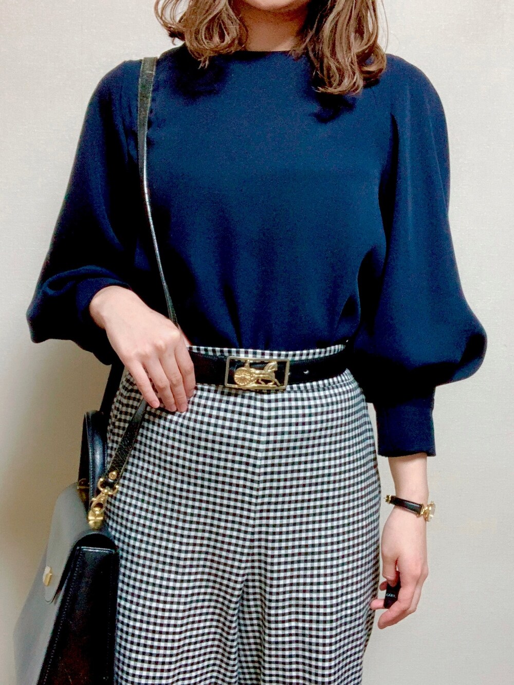 いつもいいねありがとうございます! 可愛くなっちゃうギンガムチェックはブラック×ゴールドのヴィンテージ小物で大人っぽく◎ ブラウスは袖口がお気に入り!