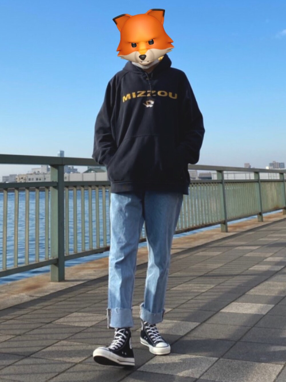 この日はラフに全振りしました。 この日はそれほど寒くなく、中にUNIQLOのヒートテックとダウンベストを着てちょうど良い温度でした。 上は古着屋で買ったNIKEのパーカーでミズーリタイガース・フットボールの刺繍が入っています。 ALL STARはメイドインジャパンの物です。