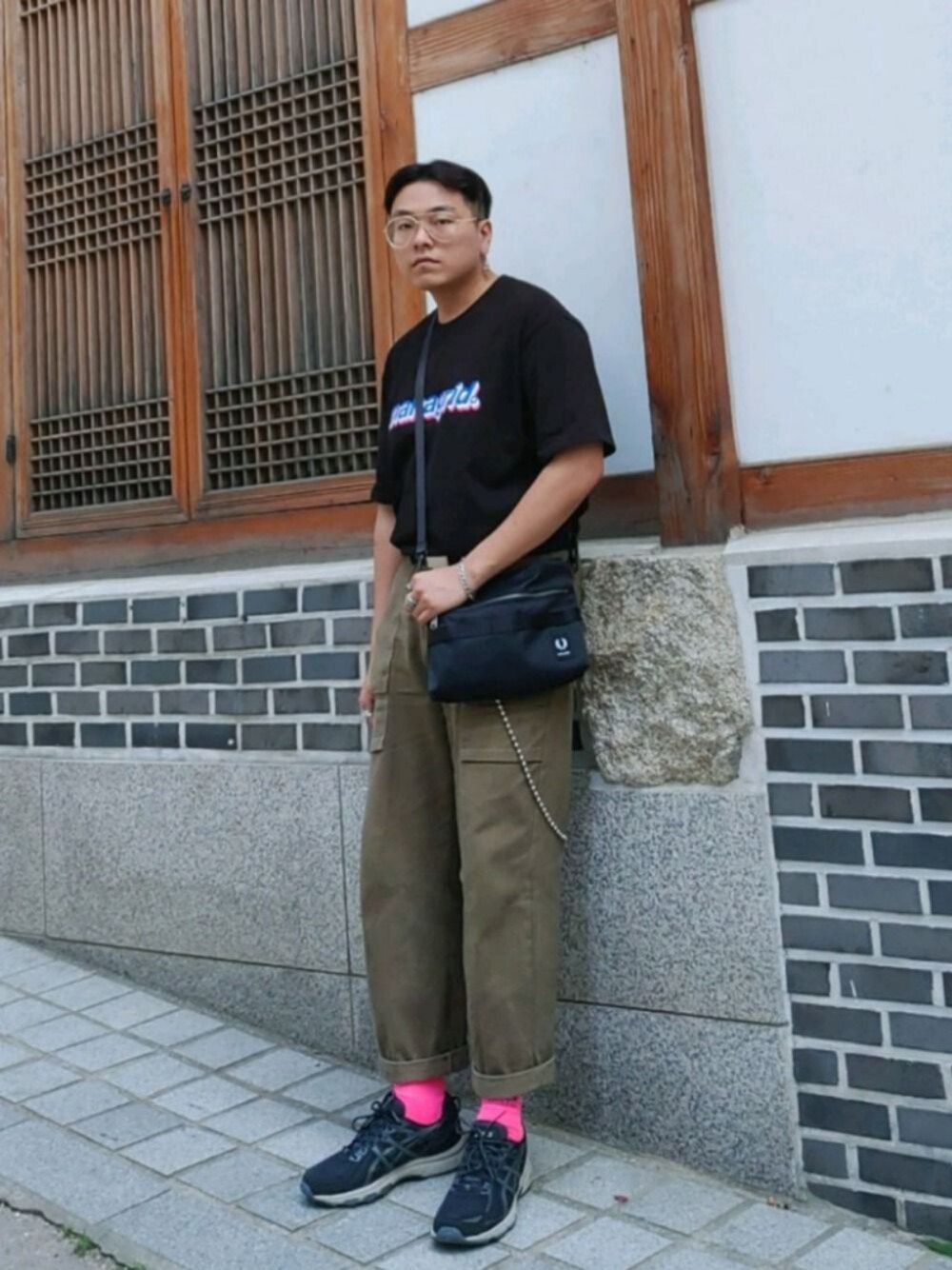 韓國時裝混搭(IG: cehtot_a) 以鮮明色彩logo tee為主軸,利用上身logo色彩與配件襪子做對應,搭配較硬挺復古風格橄欖綠工作褲,以及腳上Asic venture跑鞋,營造獨有的休閒混搭風格,單肩包深藍對應鞋款配色,讓整體搭配更有完整性。