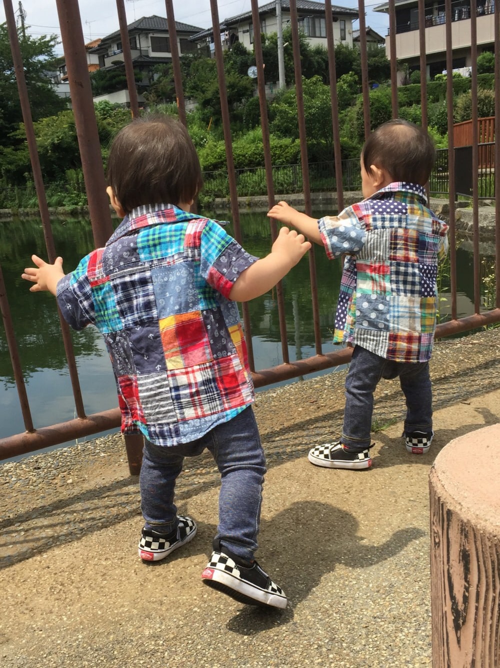 池のある公園へ◁ 鯉と亀がたくさんいて、 ふたりとも興味津々◁ 母ちゃんもシャツ×デニム×VANSでリンク◁◁