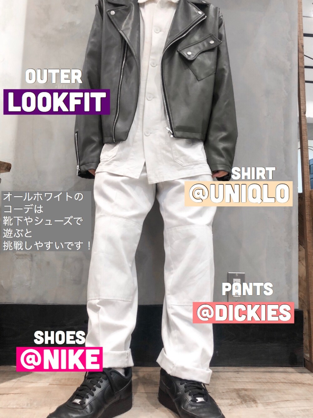 オールホワイトのコーデです! ライダースは普通に着るのに 少し飽きてきました。