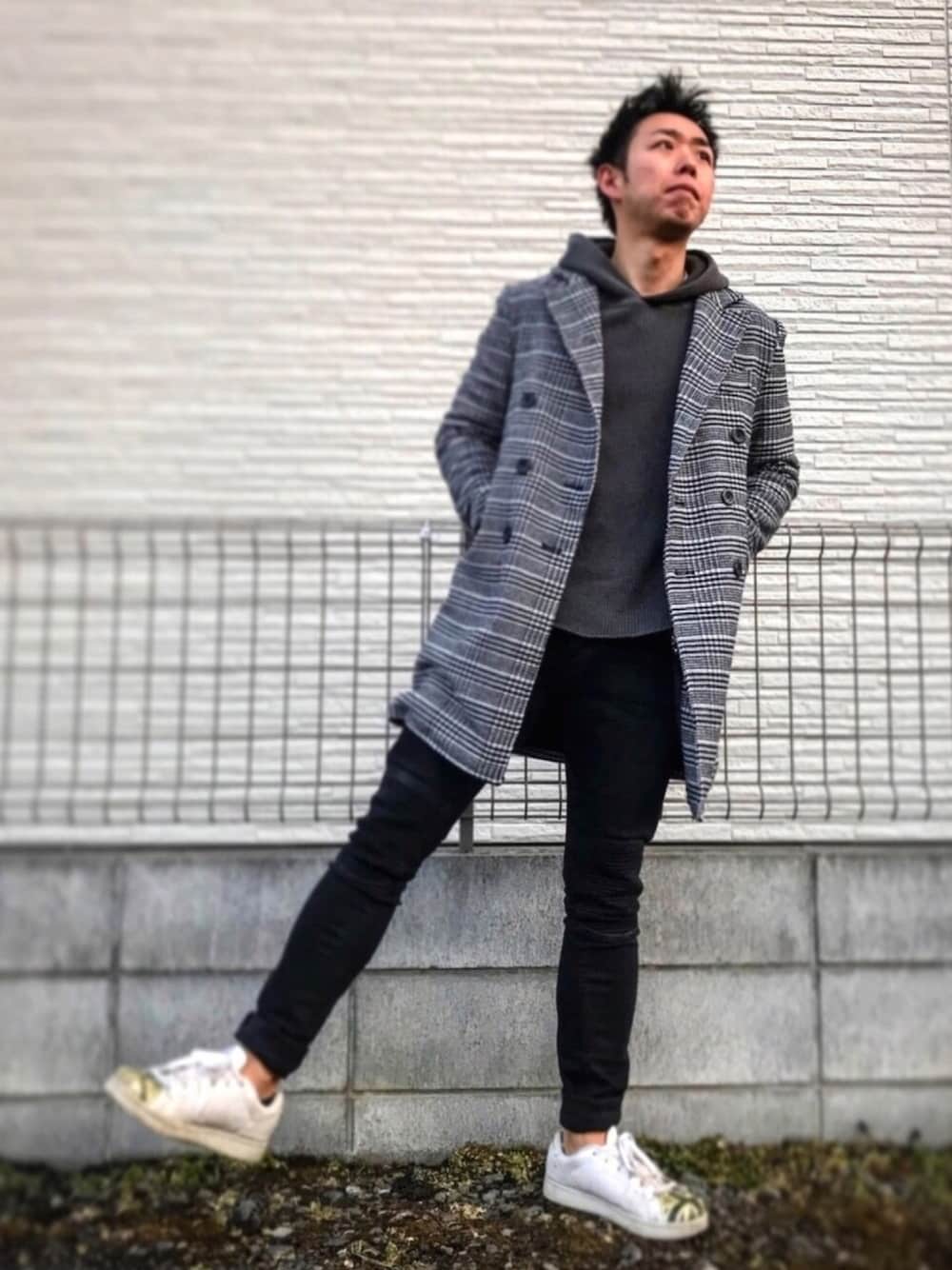 まだなんか寒い日も続くし、 もうちょい冬っぽい服装も しておこうかなコーデ🖕 うん、今日も長いね😆 コートが柄物なので、 その他はシンプルに。 improvesのコートはプチプラだけど、 かなり良い感じです🙆♂️ Reebokのつま先 ユニオンジャック🇬🇧なのがポイント💡