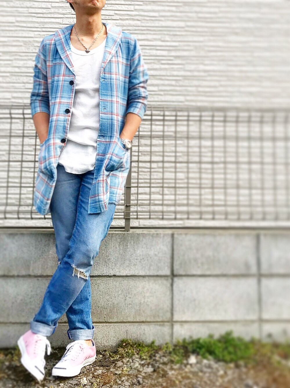 ロング丈な気分で春っぽく 爽やかぶってみたよコーデ🖕 ジャックパーセルはピンクに見えるけど、 マルチカラーになっとります✌️ 小窓ご覧くださいな🙄