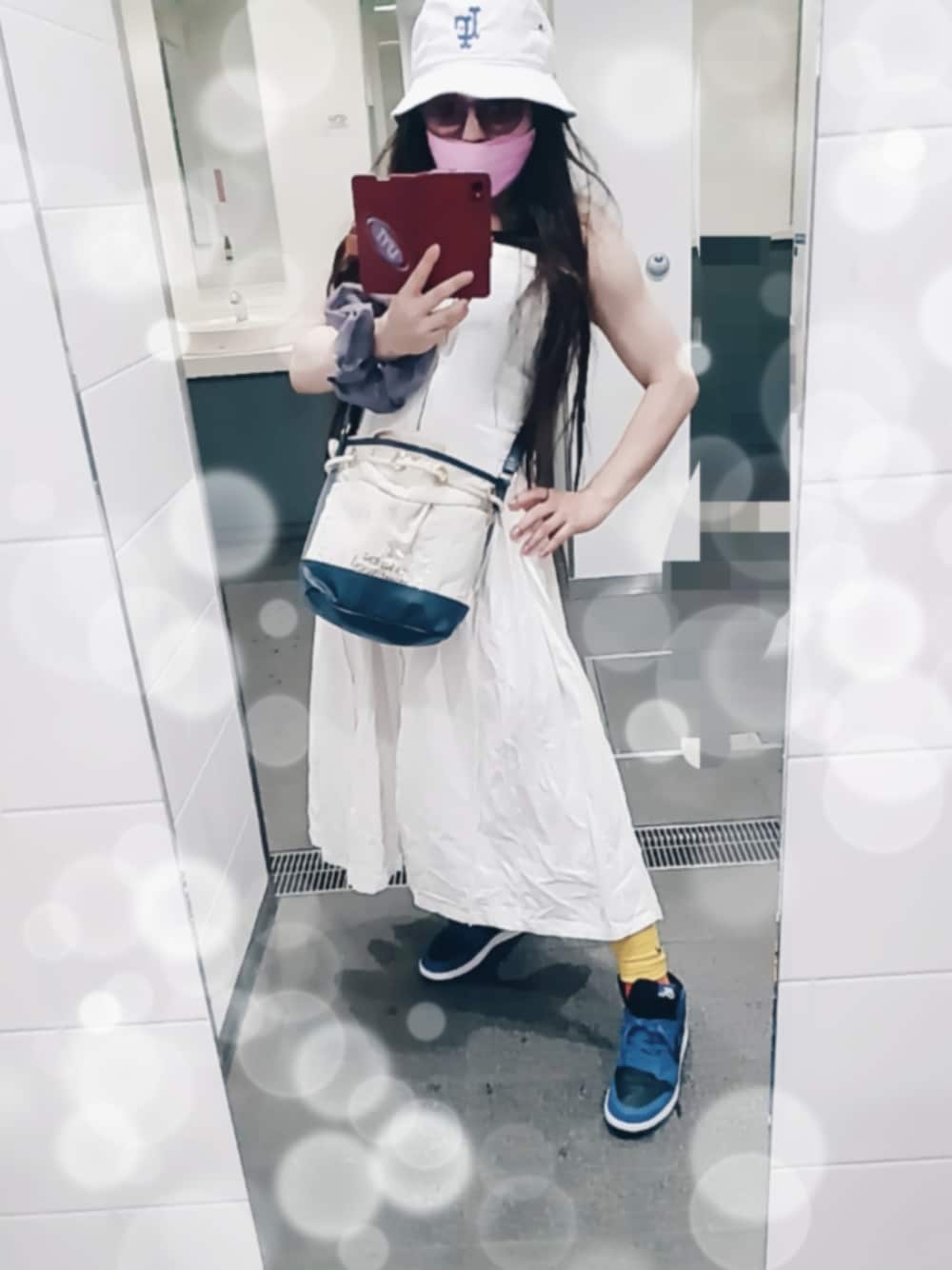 久しぶりなセルフィー✨ 暑すぎたので 見た目だけでも涼しく 足元以外は オールホワイト❗ AIR JORDAN1とカラフルソックスで 夏ぽさだしました笑