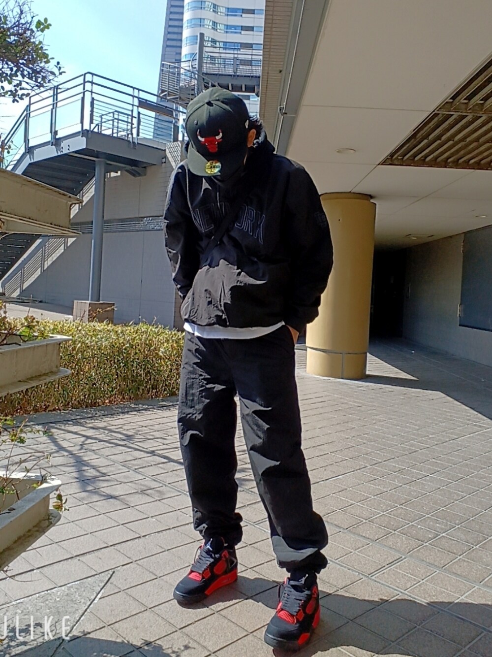 連投二回目❕笑 こちらのBLACKコーデは 暖かい冬の日でした⭐ Bullsキャップと AIR JORDAN4の 色合わせが絶妙に カッコ良い😆😆