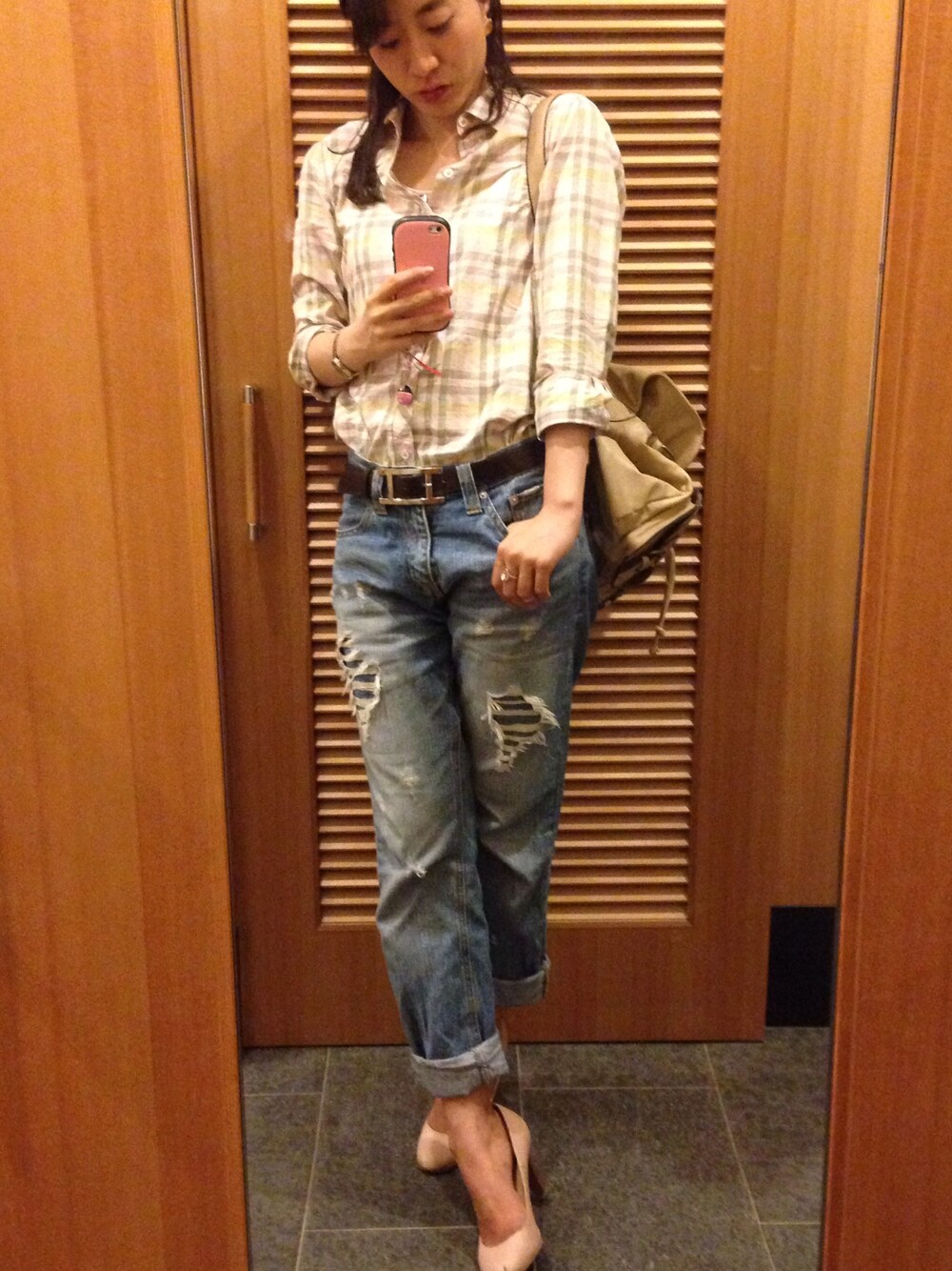 チェックシャツ:ROPE' PICNIC デニム:ブランド不明 パンプス:RANDA バッグ:cache cache