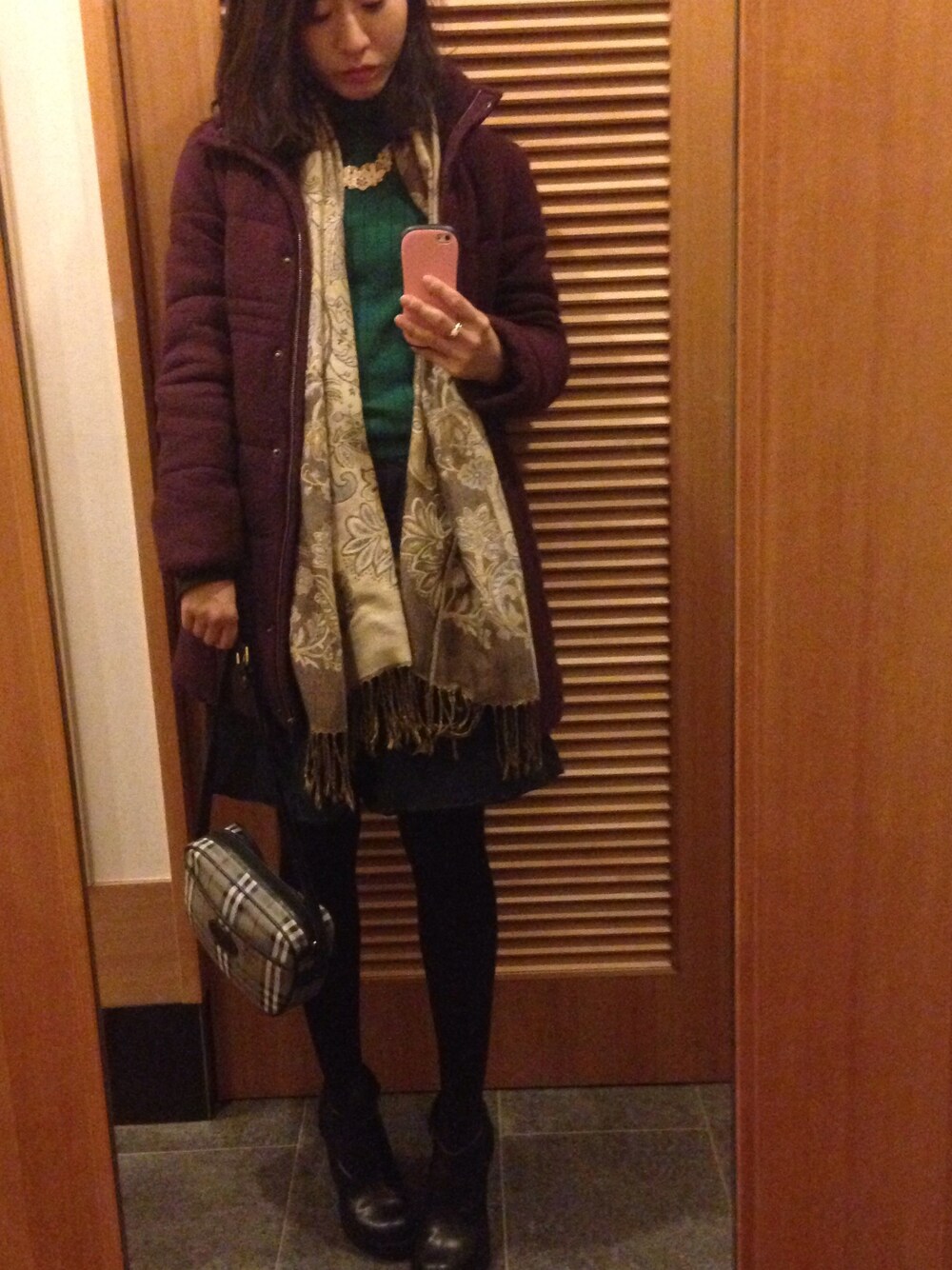 コート○Ciaopanic Typy ハイネック◎ブランド不明 スカート♡UNITED ARROWS マフラー♢GALLERIE ブーツ♤WHO'S WHO gallery バッグ♧burberry ネックレス*FOREVER21 学生時代の友達と忘年会。 コートを脱いだらシンプルに。 このハイネック、この前買って今日初めて着たよ٩( *˙0˙*)۶お気に入り♡