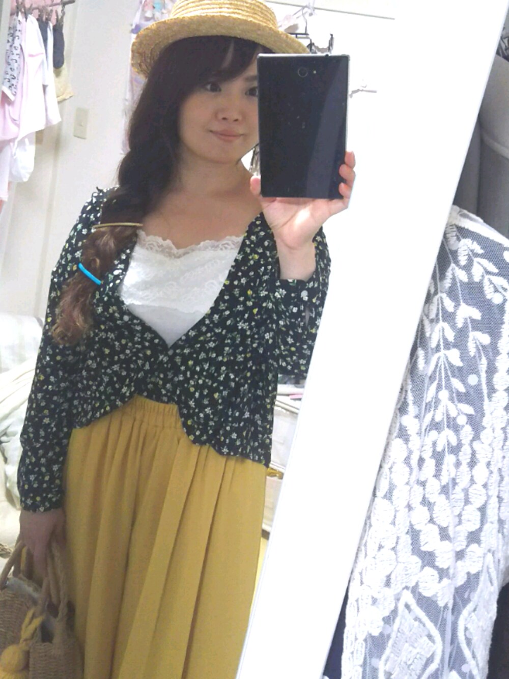 niko and…のブラウスはイエローの花柄で、 ワイドパンツのカラーとリンクさせています。 毎回身長入れるのめんどくさぁーい(´ε`;)ゞ