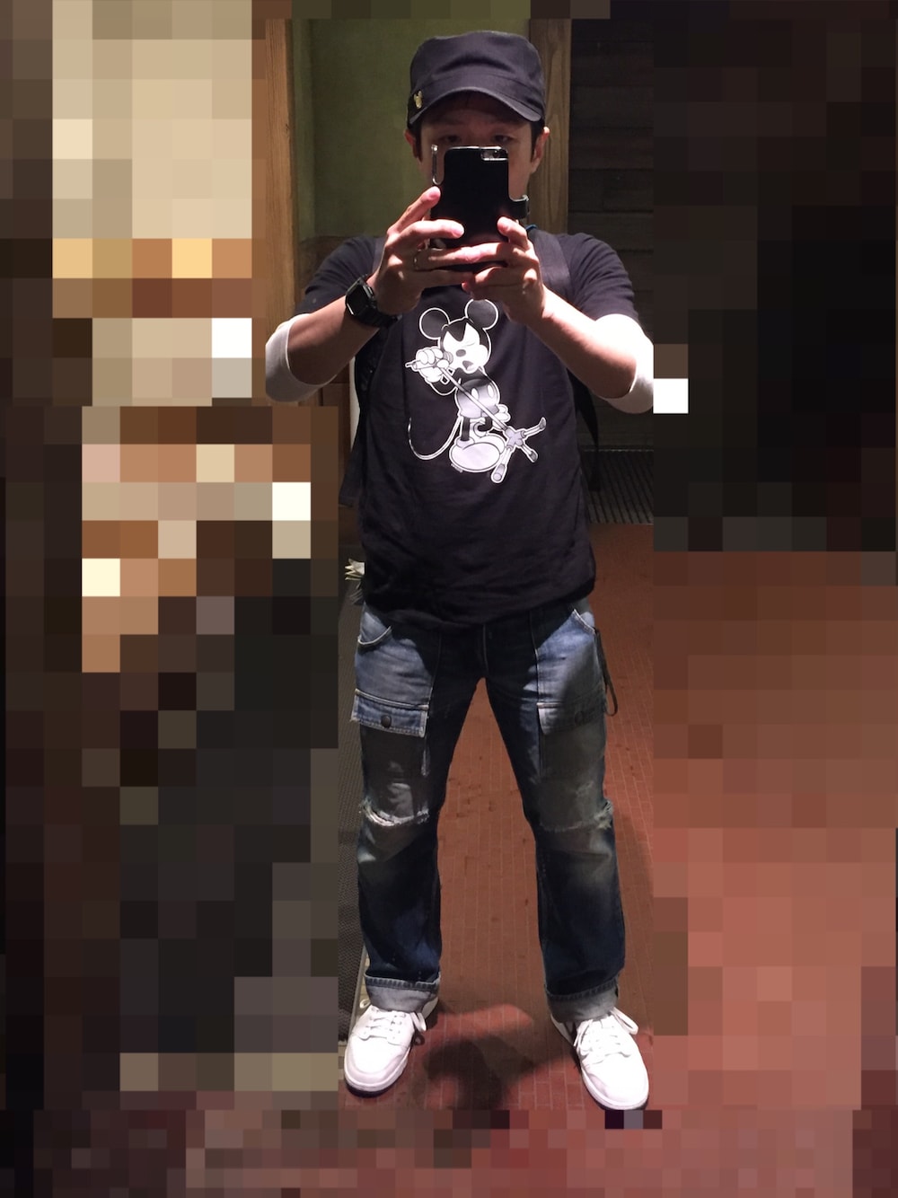ディズニー二日目、Sea仕様です✨ ナンバーナインのTシャツにUNIQLO七部丈の白Tは前回と同じですがブッシュパンツを合わせてみました。ブッシュパンツは両膝穴が空いていて寒そうだったのでズボン下履いてみました😁 夕方以降も問題なしでした😉✨