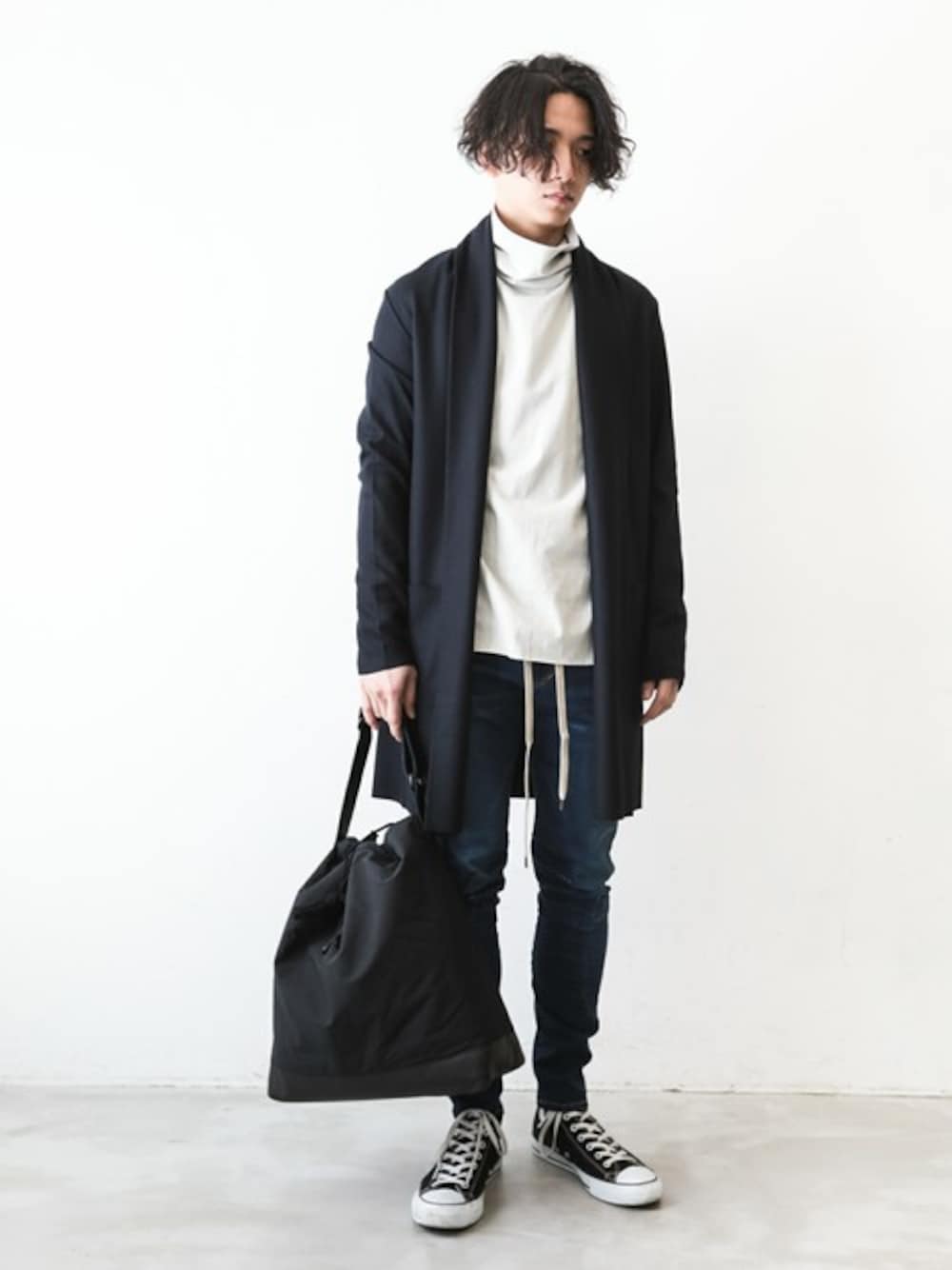 上質なウール素材の軽量コートのスタイル。 柔らかく軽量ながら保温性の高いイージーなコート。 タートルを合わせて今年っぽくスタイリングしてみました。