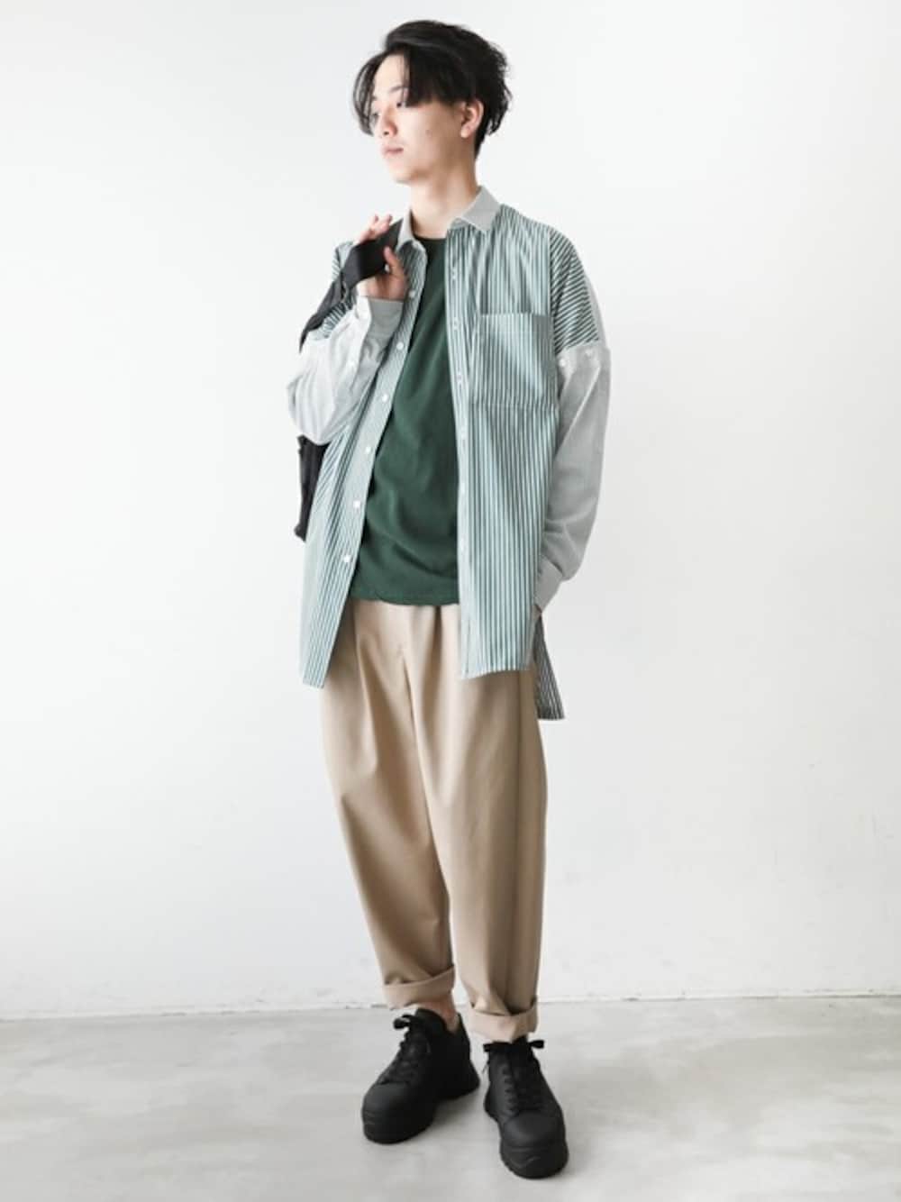 トレンドのグリーンを使ったコーディネート。 シャツとインナーを同色にすることで統一感のあるバランスの良いスタイリングに。 ベージュとの相性も抜群で、全体をマイルドな印象に中和してくれます。