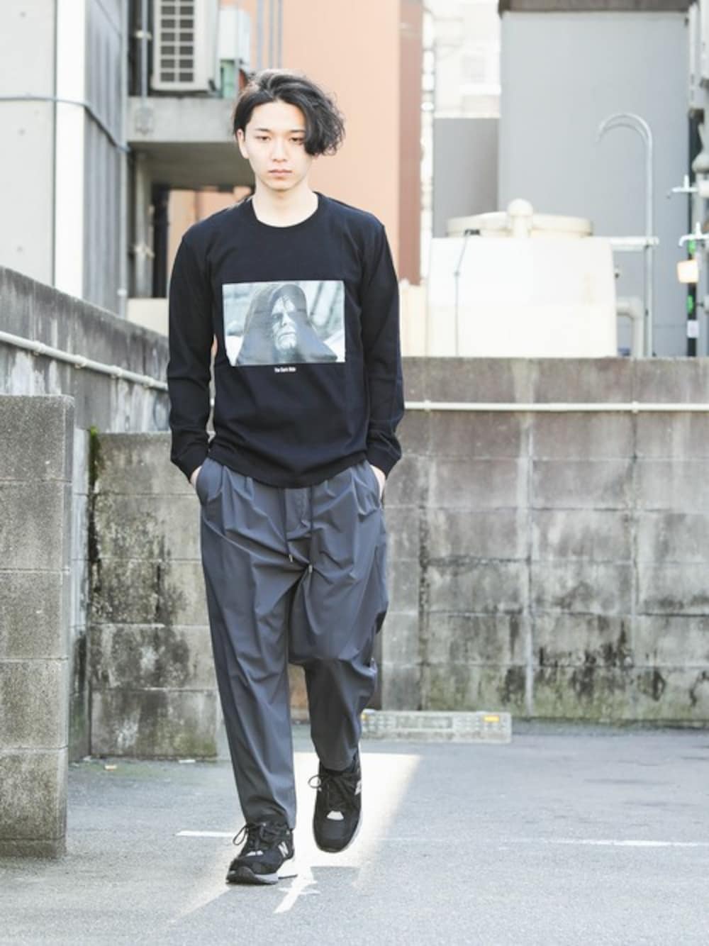 存在感のあるstarwarsコラボのロンTは一枚でも着映えするアイテム。 イージートラウザーズに合わせて大人っぽく。