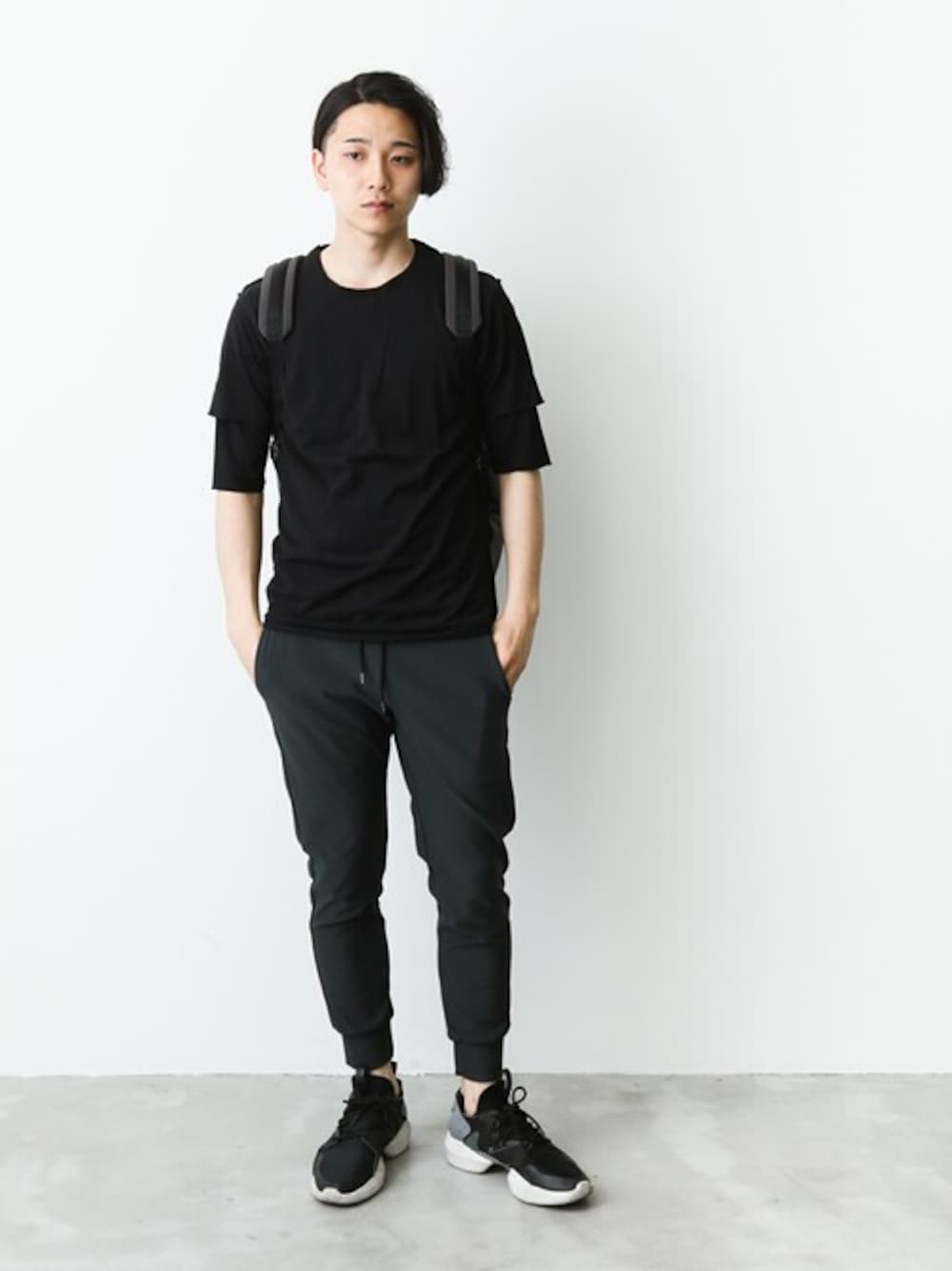 ブラックのワントーンコーデ。 カジュアルなアイテムも、トーンを合わせることで都会的な印象に!