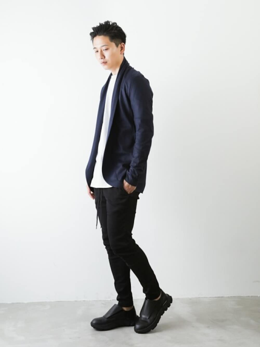 リラックス感漂う大人カジュアルスタイル。 カーディガンジャケットとイージーパンツ仕様のスキニーパンツが、 細身でシャープな印象ながら、リラックス感のある大人な雰囲気を演出してます!