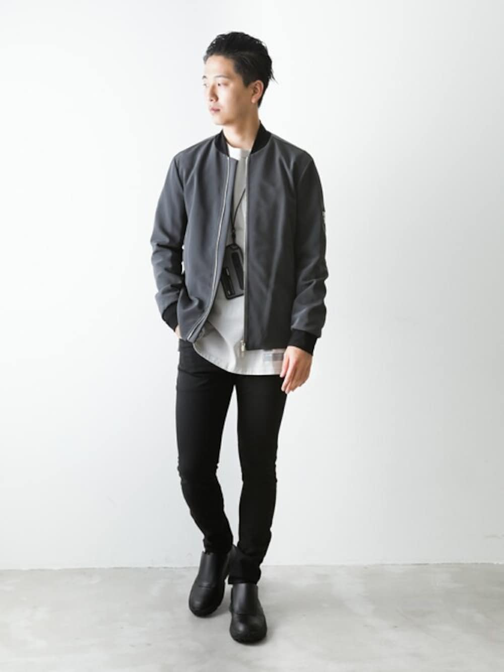 細身のMA-1にスキニーデニムを合わせて。 都会的な印象のGRAYが印象的なMA-1オススメです。
