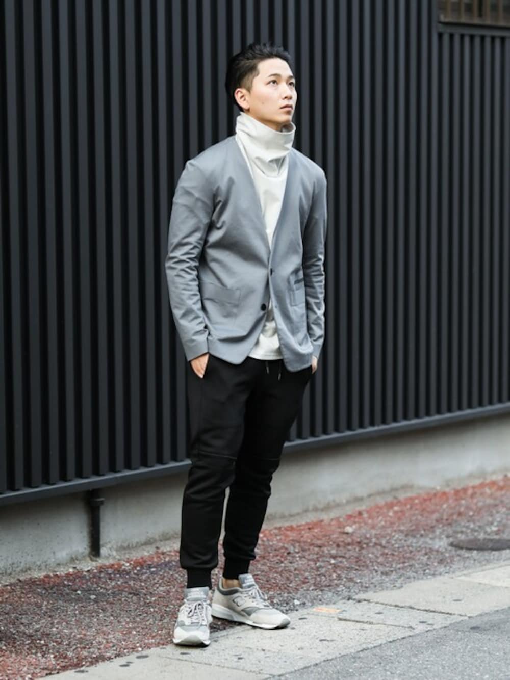 トレンドのノーカラージャケットのリラックススタイル。 抜け感のあるノーカラージャケットにジョガーパンツを合わせてリラックス感を演出。 インにタートルを入れることでリラックス感がありながらも、大人びた上品な印象に仕上げてみました。
