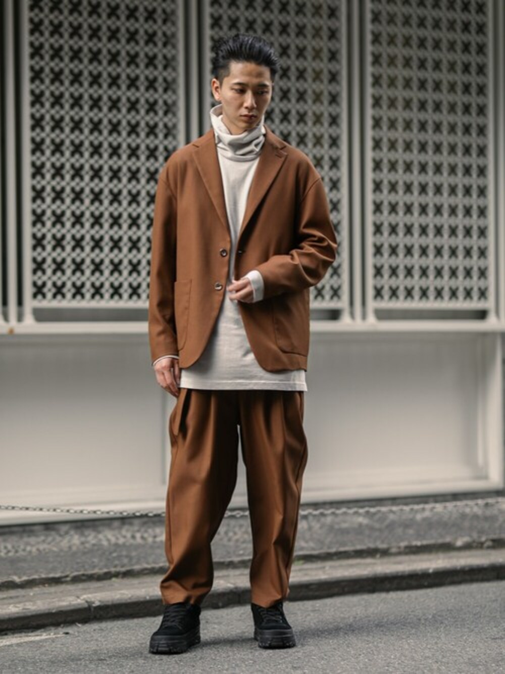 オーバーサイズにデザインされたセットアップスタイル。 肩をドロップさせゆったりとしつつも、全体としてはスッキリとした印象にまとめ、 大人の方でもベーシックに着回せるシルエット。 イージーパンツ仕様のワイドトラウザーズも快適な穿き心地。