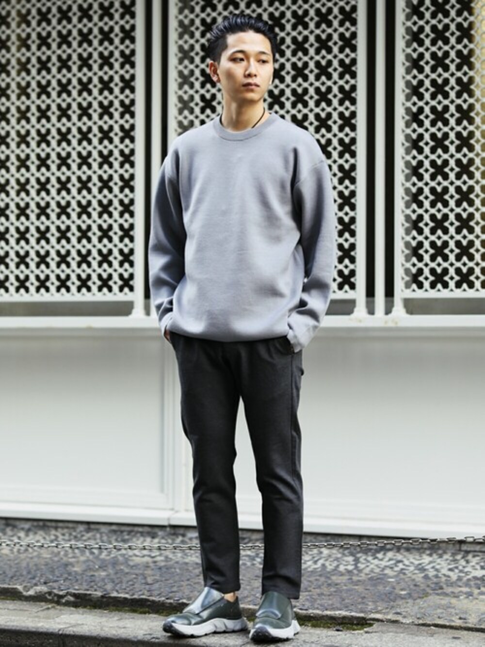 リラックス感のある大人のニットスタイル。 ジャージー素材のスラックスに合わせてオフ感を演出。