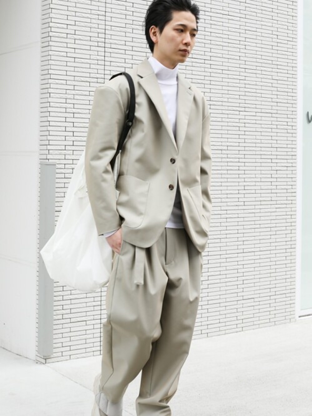 春らしいライトベージュのセットアップスタイル。 グレイッシュなベージュカラーで使い回ししやすい。 アクセントでホワイトを効かせて、キレイ目な印象に。