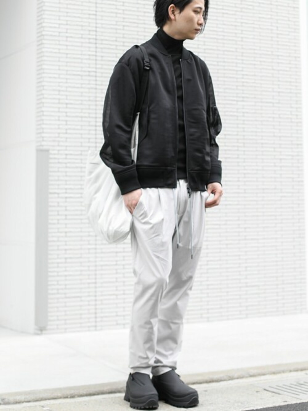 春のMA-1スタイル。 シアー素材を使用しており、ベーシックに見えながらも清涼感のある新鮮な雰囲気に。