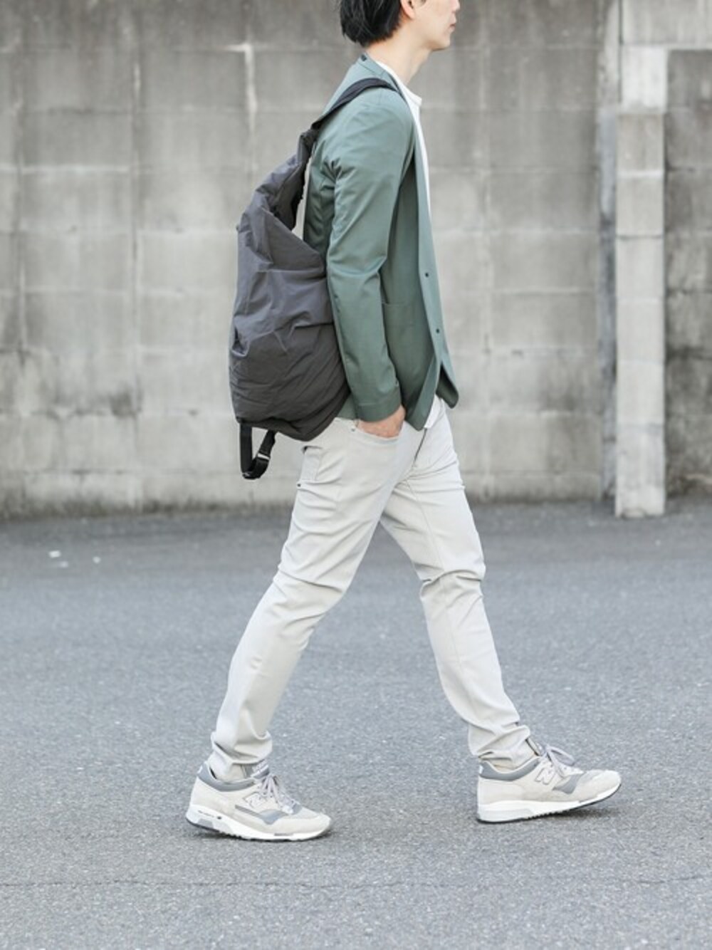 aoiのテーラードジャケット「HIGH GAUGE JERSEY COLLARLESS TECHNICAL BLAZER」を使ったコーディネート