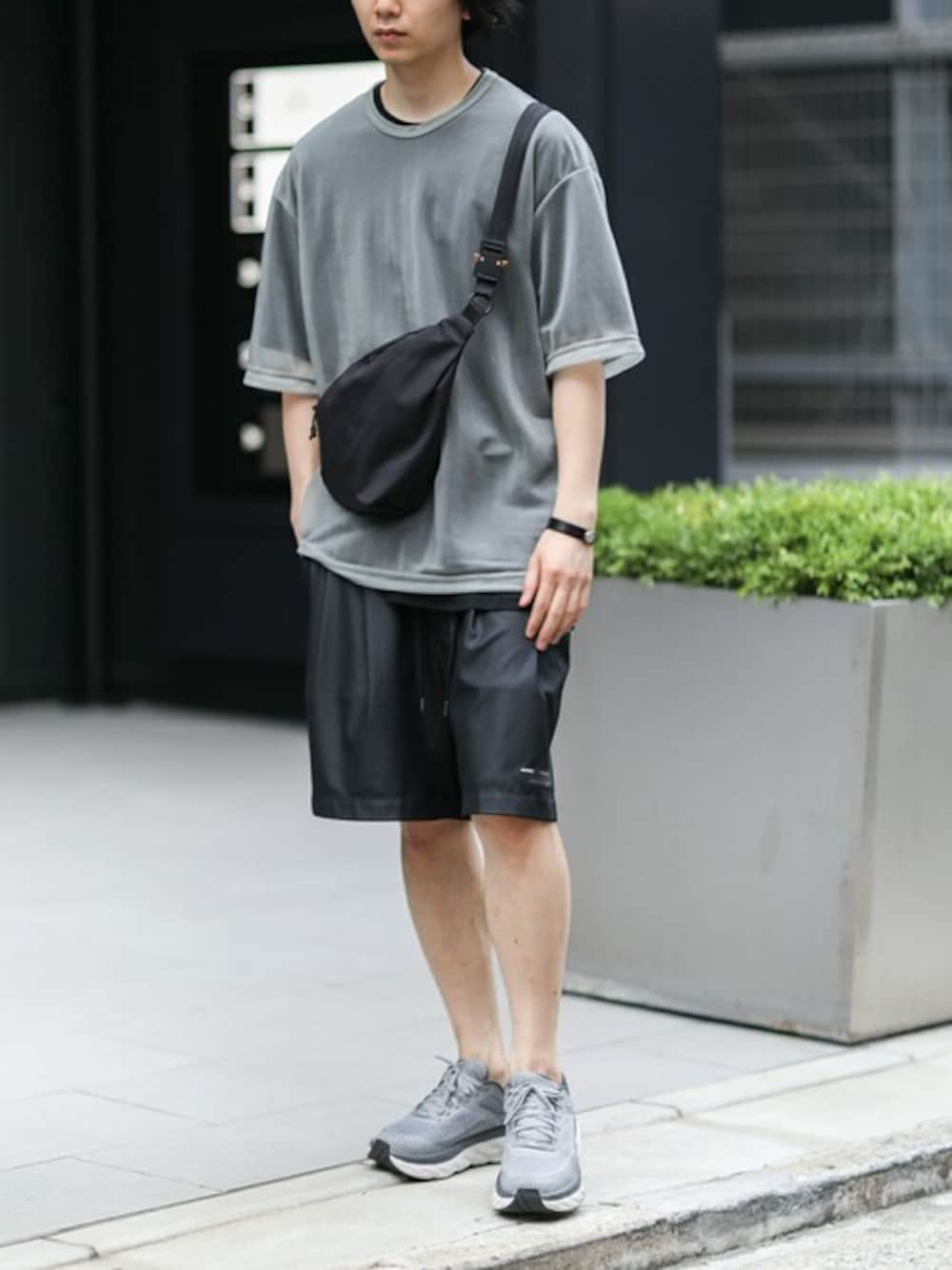 見た目にも涼しげなシアー素材のTシャツスタイル。 コーティングのショートパンツに合わせて素材感を楽しむスタイルに。
