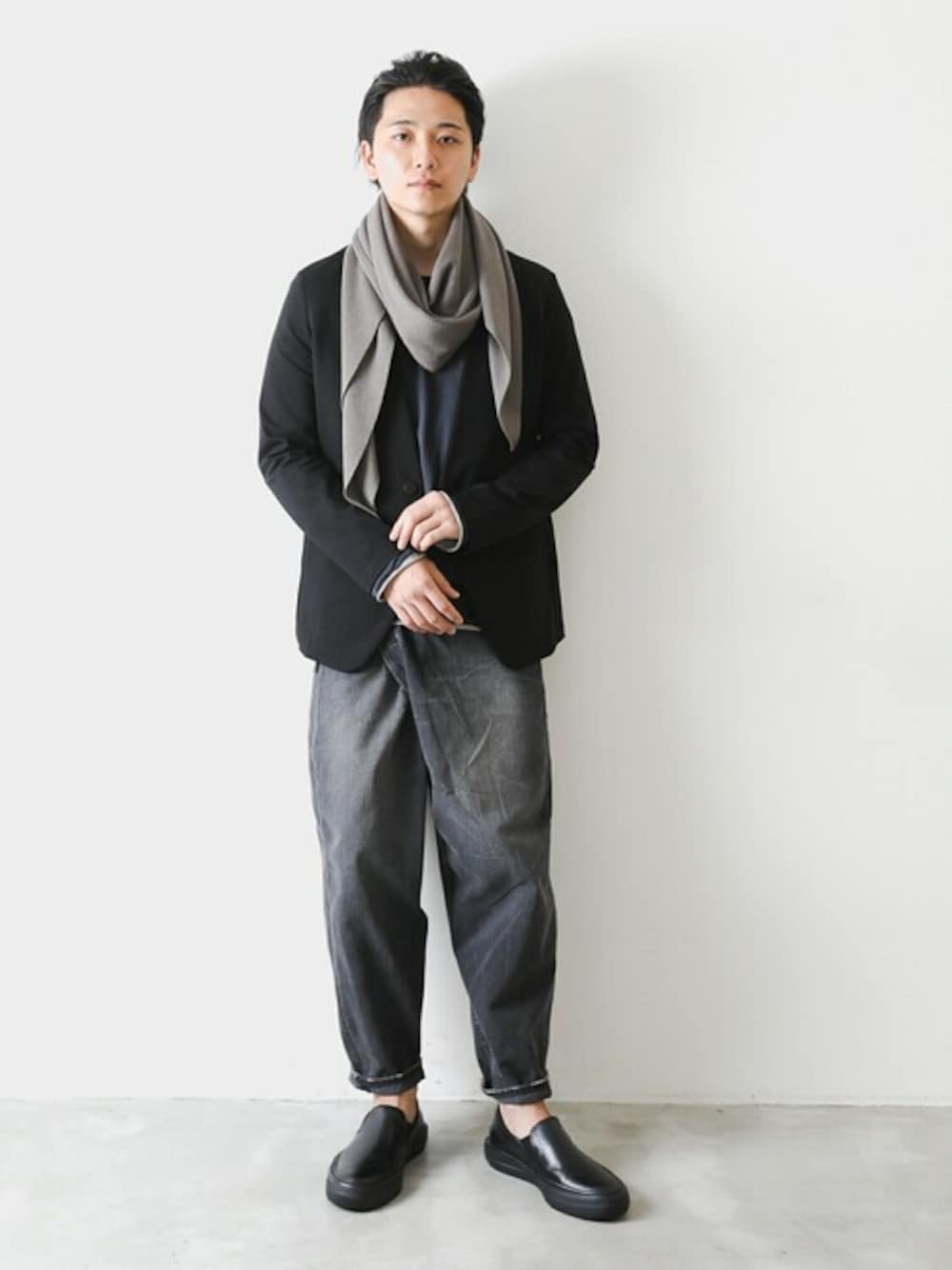 程よい抜け感のあるノーカラーのジャケットスタイル。 カーディガンのようなリラックス感がちょうど良い。 新色のブラックデニムにスリッポンを合わせて大人っぽく。