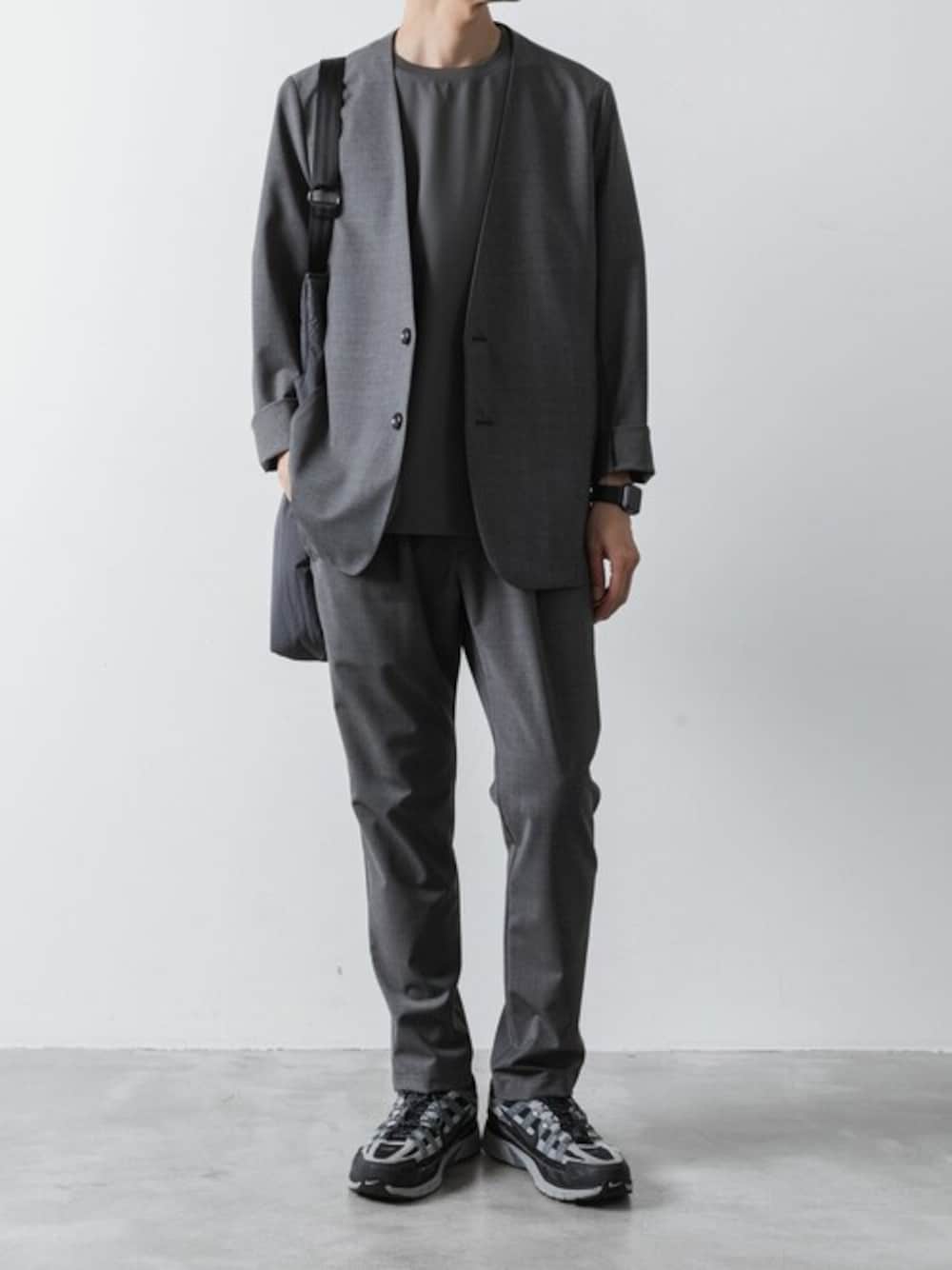 aoiのノーカラージャケット「2/80 PE/WO ストレッチトロ カラーレスジャケット / 2/80 PE/WO STRETCH TRO COLLARLESS JKT」を使ったコーディネート