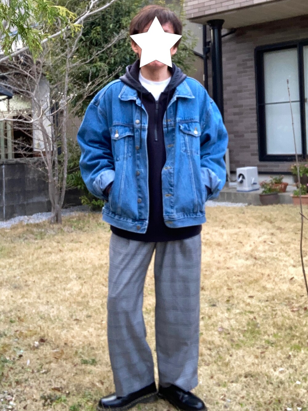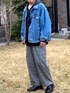 デニムジャケットを少しでもキレイめにできないかと、グレンチェックなスラックスとあわせてみました。 パーカーもツヤ感のある素材で。