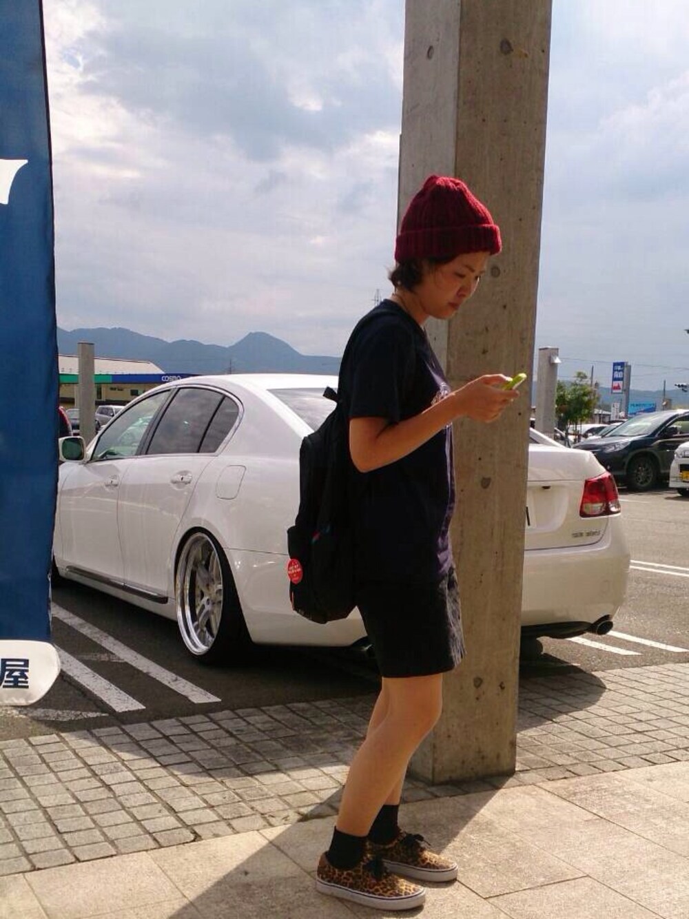 モノトーン色なので、差し色にニットキャップで赤、足元でレオパードチョイスしてみました😊✨ リュックの缶バッジは古着屋より。 後ろの車は私の車ではありませんよ🌝💡