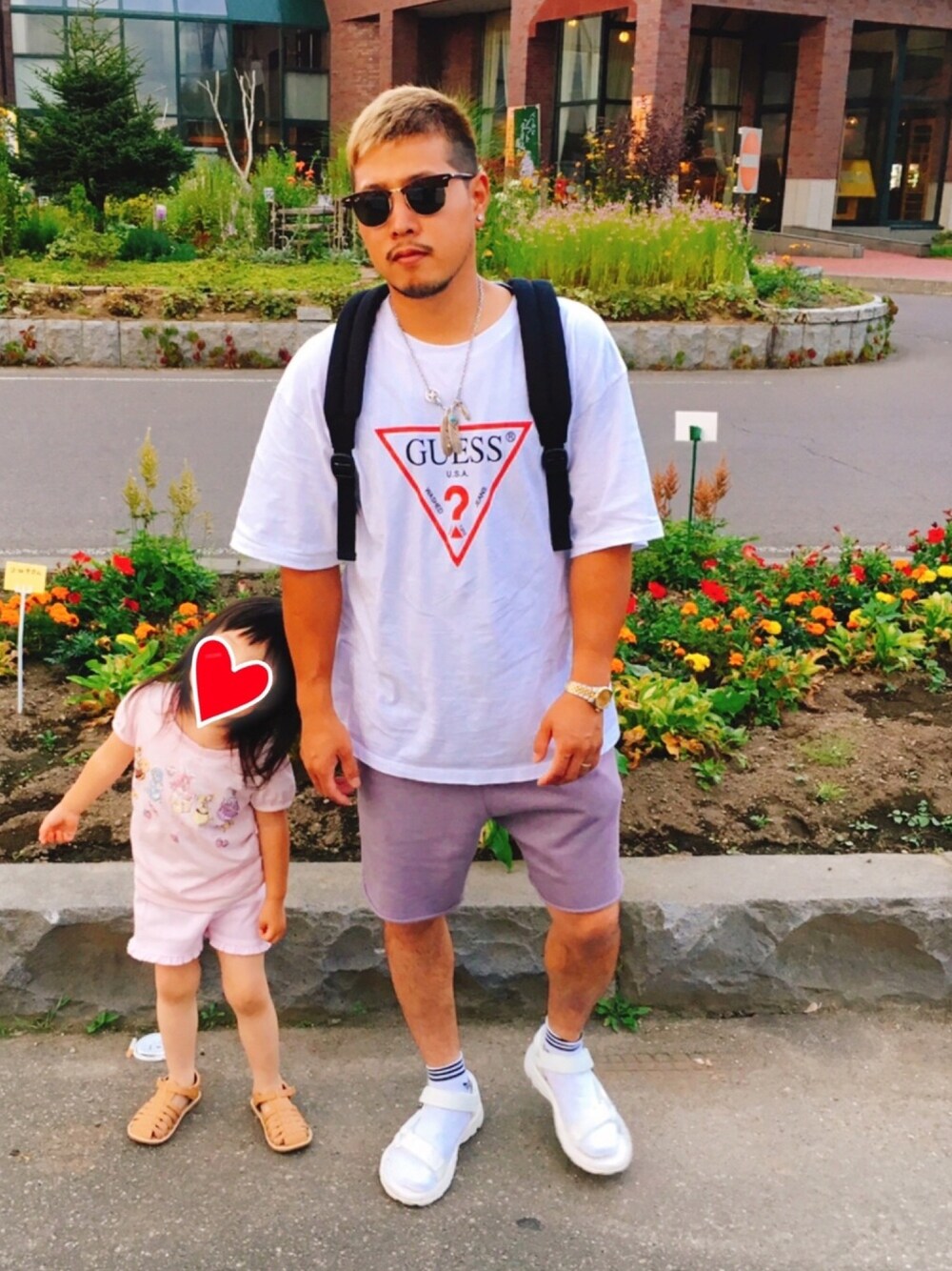 今日わ久々に家族で温泉に行ってきました(^ ^)🤘 チビちゃんと一枚😍 guessのビッグTにH&Mの薄紫?のハーフパンツ❤️ もぉ夏終わったと思ってたらいきなりの暑さです😱