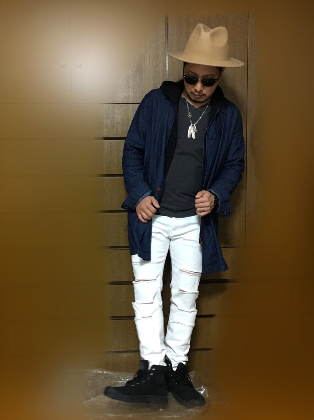 ロング丈のデニムシャツにホワイトパンツを履いてみました このホワイトパンツ購入してから全然履いてなくて初めて履いてみました☆ ハットわベージュで合わせてみた〜♪