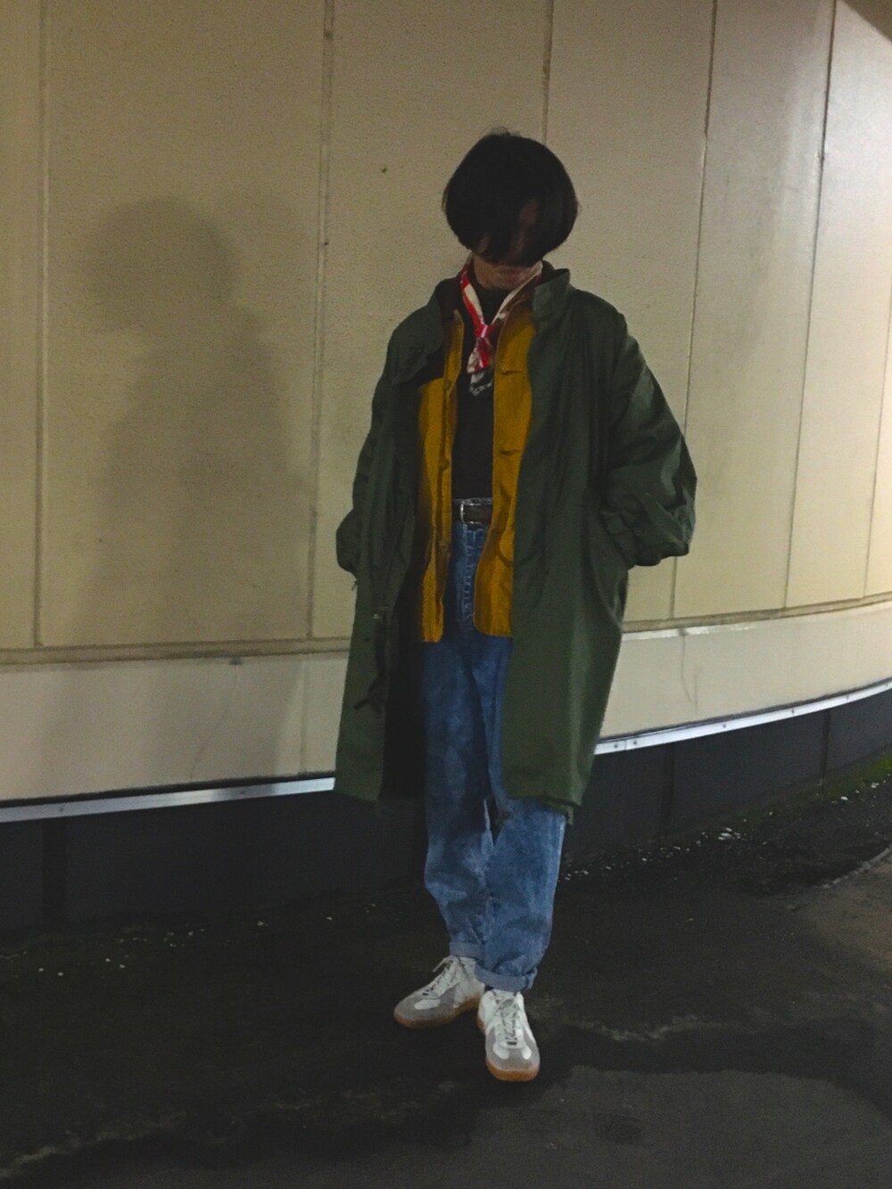 outer:m65 fishtail parka jacket:60s hunting jacket long tee shirts:uniqlo pants:used denim pants shoes:german trainer