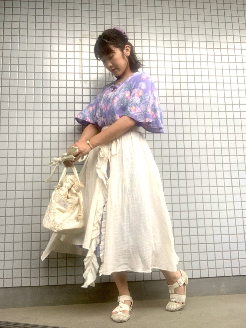 古着のフルーツ柄ワンピに merryのエプロンスカート🤍 Instagram @ayumionishi21