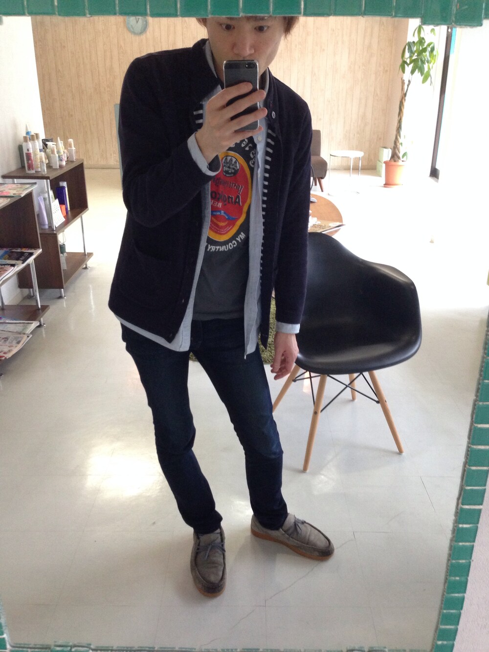 仕事上汚れが目立ちやすい色の洋服は避けてます。 だいたいグレーとかになります。 Tシャツはお客様から頂いたアンコールワットのお土産のアンコールビールTシャツ(笑) 気に入ってます^ ^