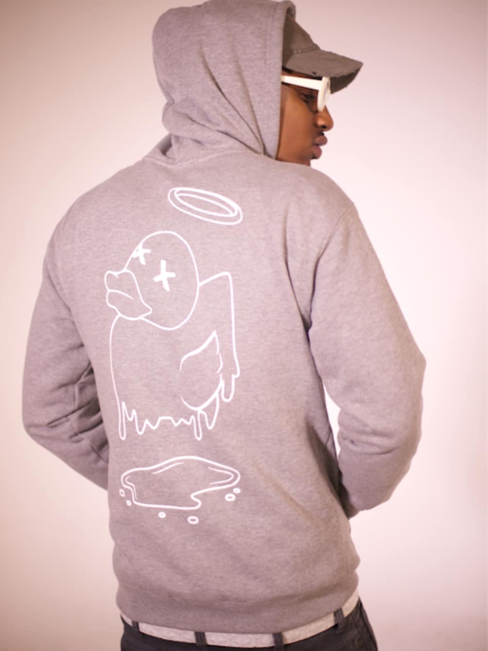 グレー系のパーカーを着用したメンズの冬コーディネートの1枚目の写真