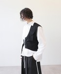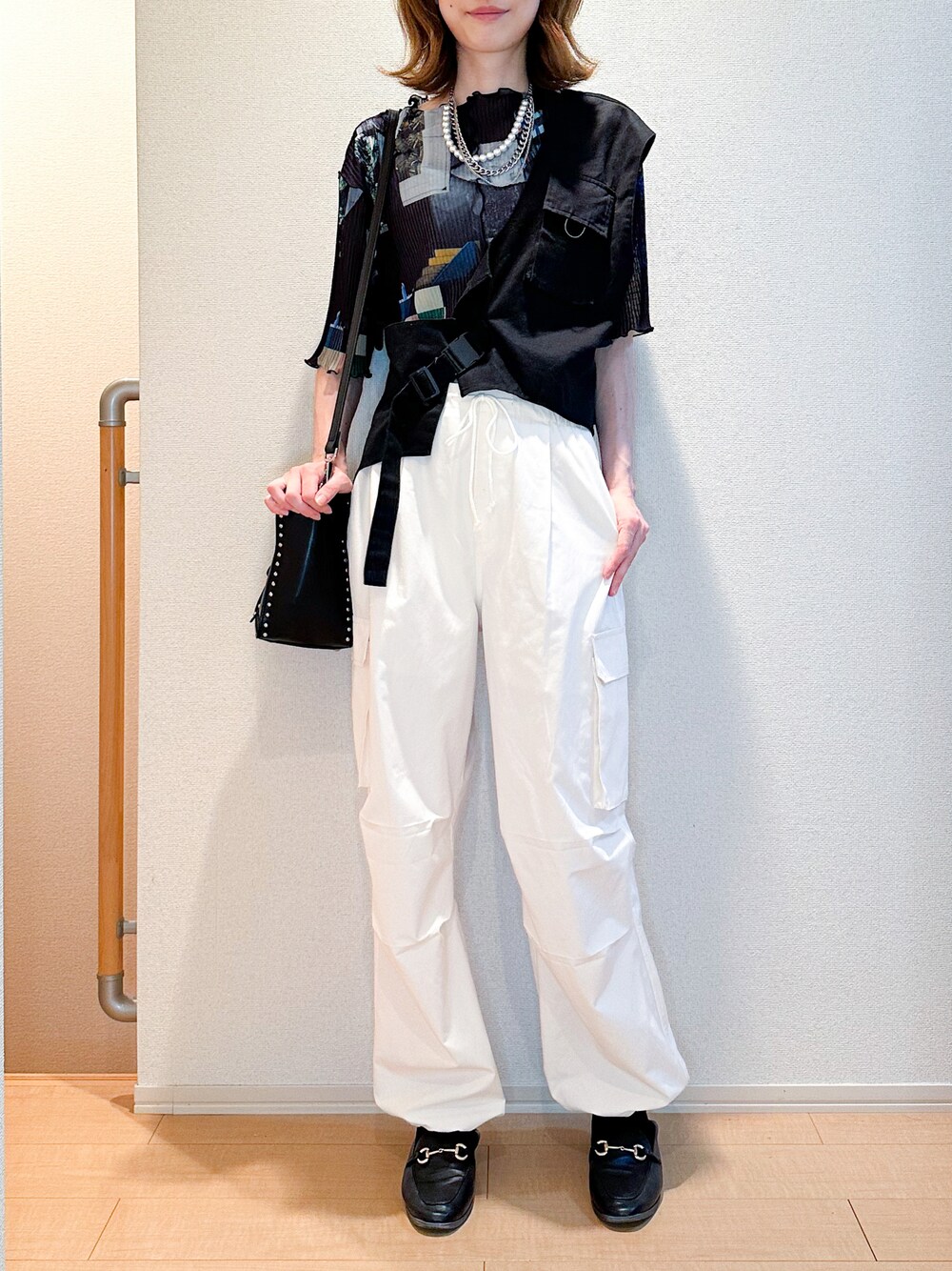 柄が可愛いシアートップスにトレンドのカーゴパンツとベストを合わせたモノトーンモードスタイリング♡ ベストはアシメデザインでお洒落感UP! GUのカーゴパンツはサラッとした素材感で今の時期も着やすく、程よいゆるっと感も良いです♪