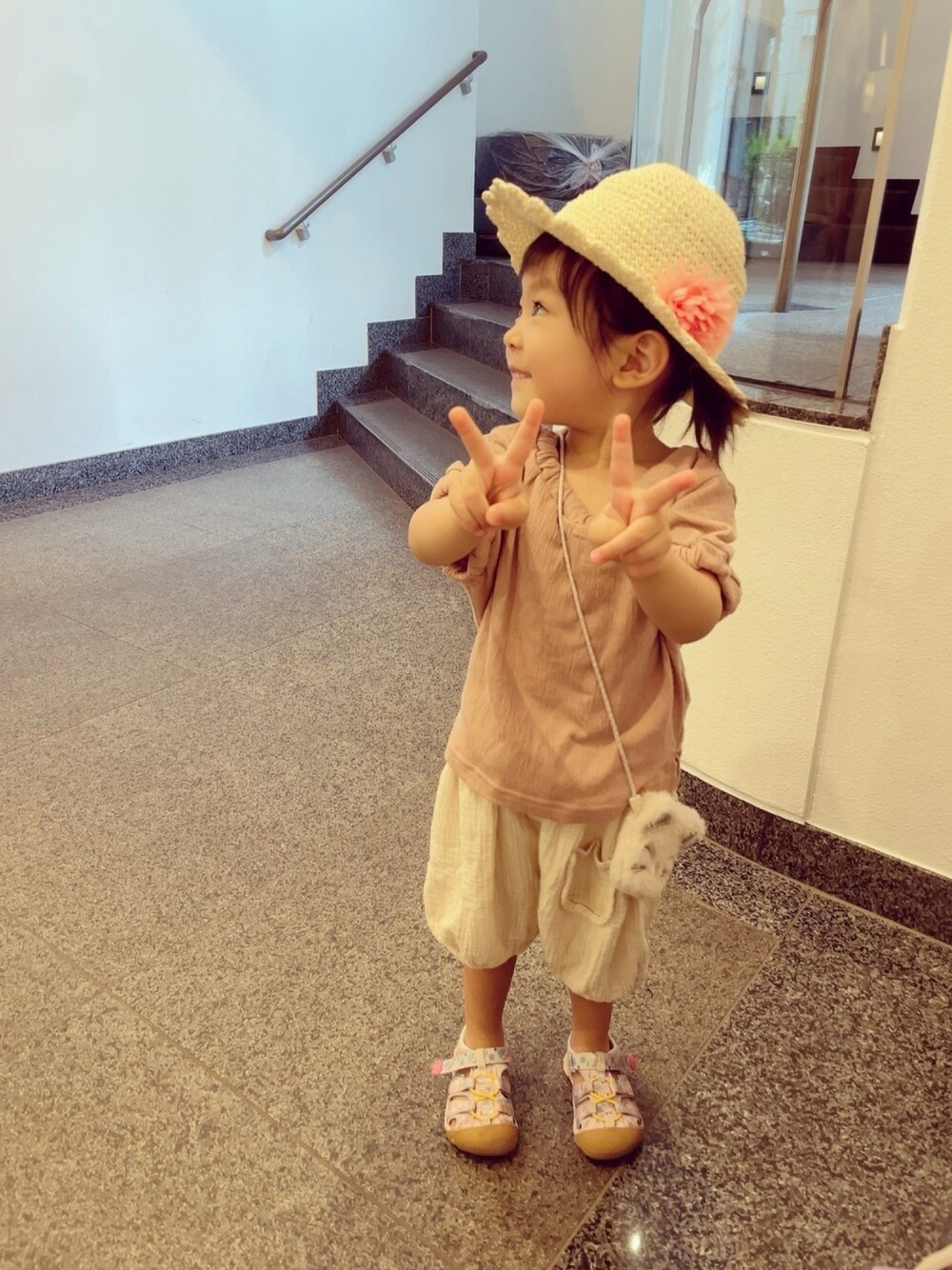 可愛い格好の時は二つ結びに。 オーガニックコットンのような生地でラフで可愛いコーデ。 帽子は1歳の時買ったからギリセーフ♪