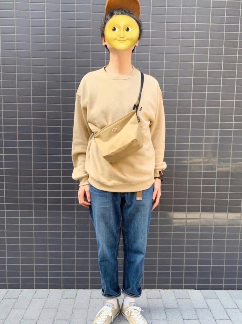 初投稿です。 男方です。 秋らしくベージュでまとめました。 スウェットとデニムのダサ可愛い感じが好きです。 デニムはUNIQLOなのですがおしりが大きくて、テーパード掛かってるのですっきりとしたシルエットになります。 追伸: 最近やっとちょうど良い気温になりましたね。 風邪には気を付けましょう。